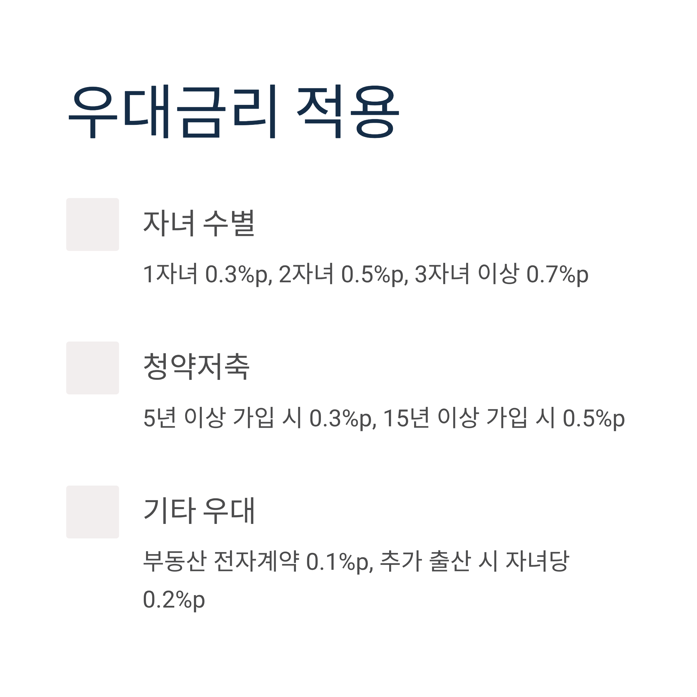 - 추가 출산 시: 자녀당 0.2%p 추가 우대