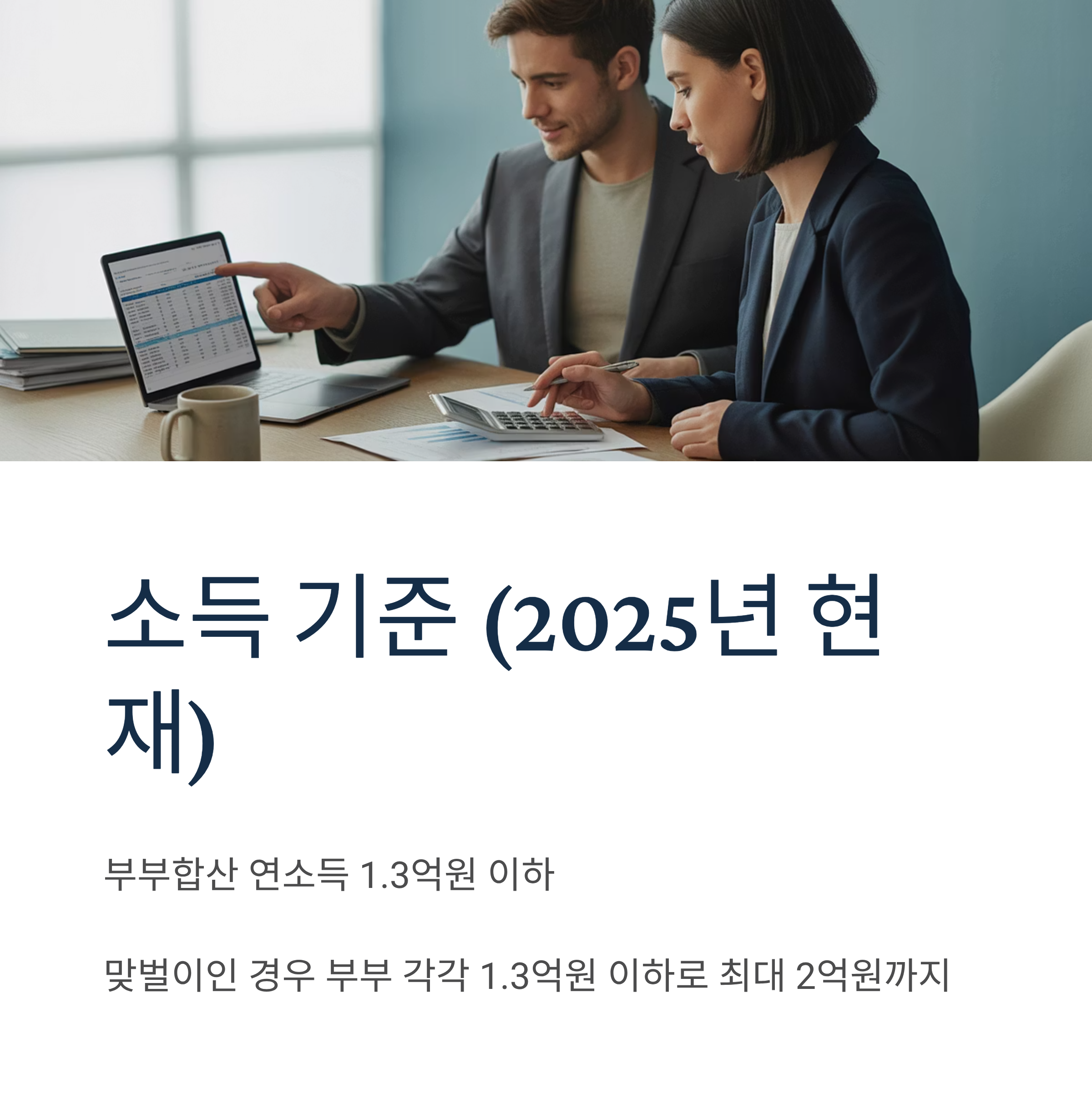 부부합산 연소득 1.3억원 이하 (맞벌이인 경우 부부 각각 1.3억원 이하로 최대 2억원까지)