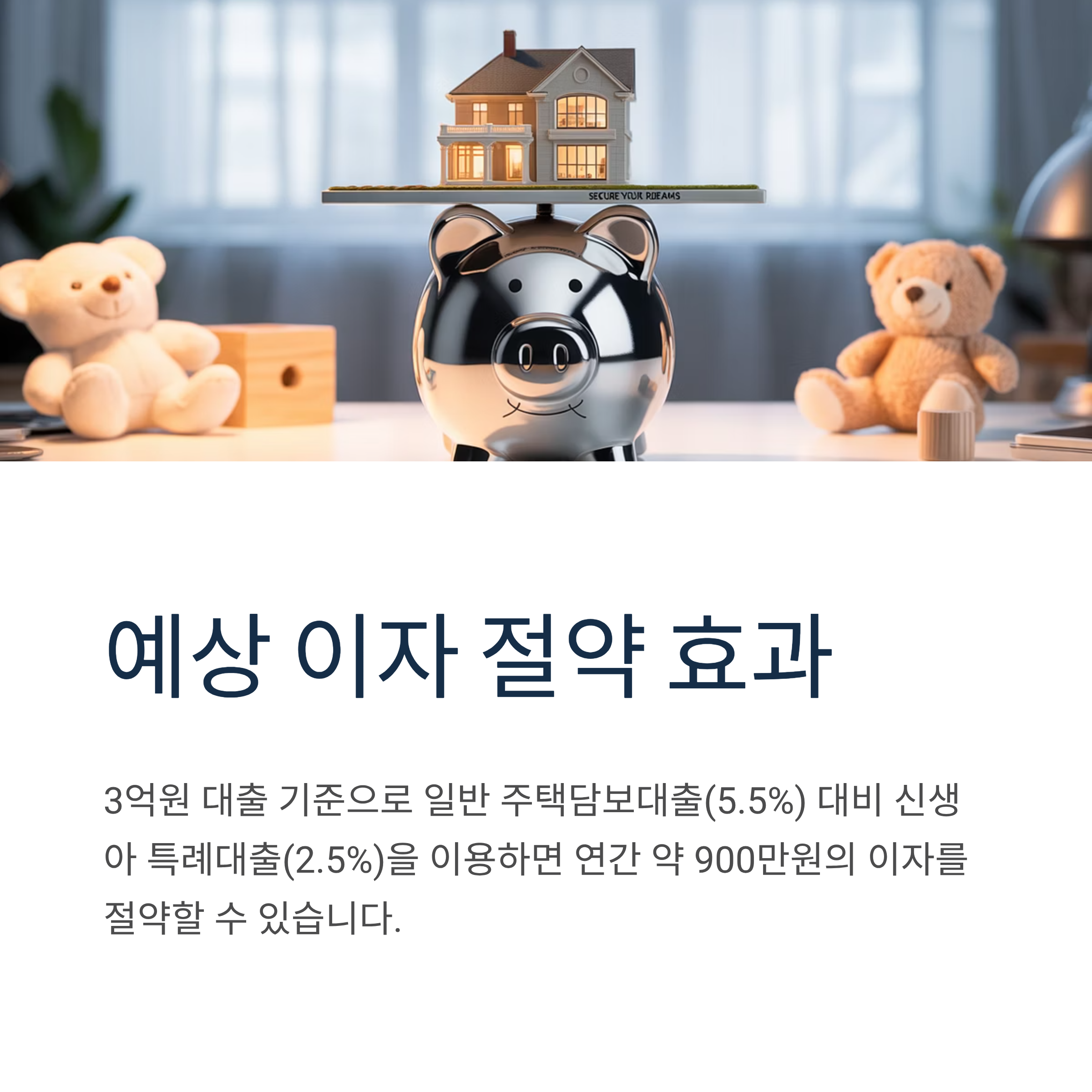 3억원 대출 기준으로 일반 주택담보대출(5.5%) 대비 신생아 특례대출(2.5%)을 이용하면 연간 약 900만원의 이자를 절약할 수 있습니다.