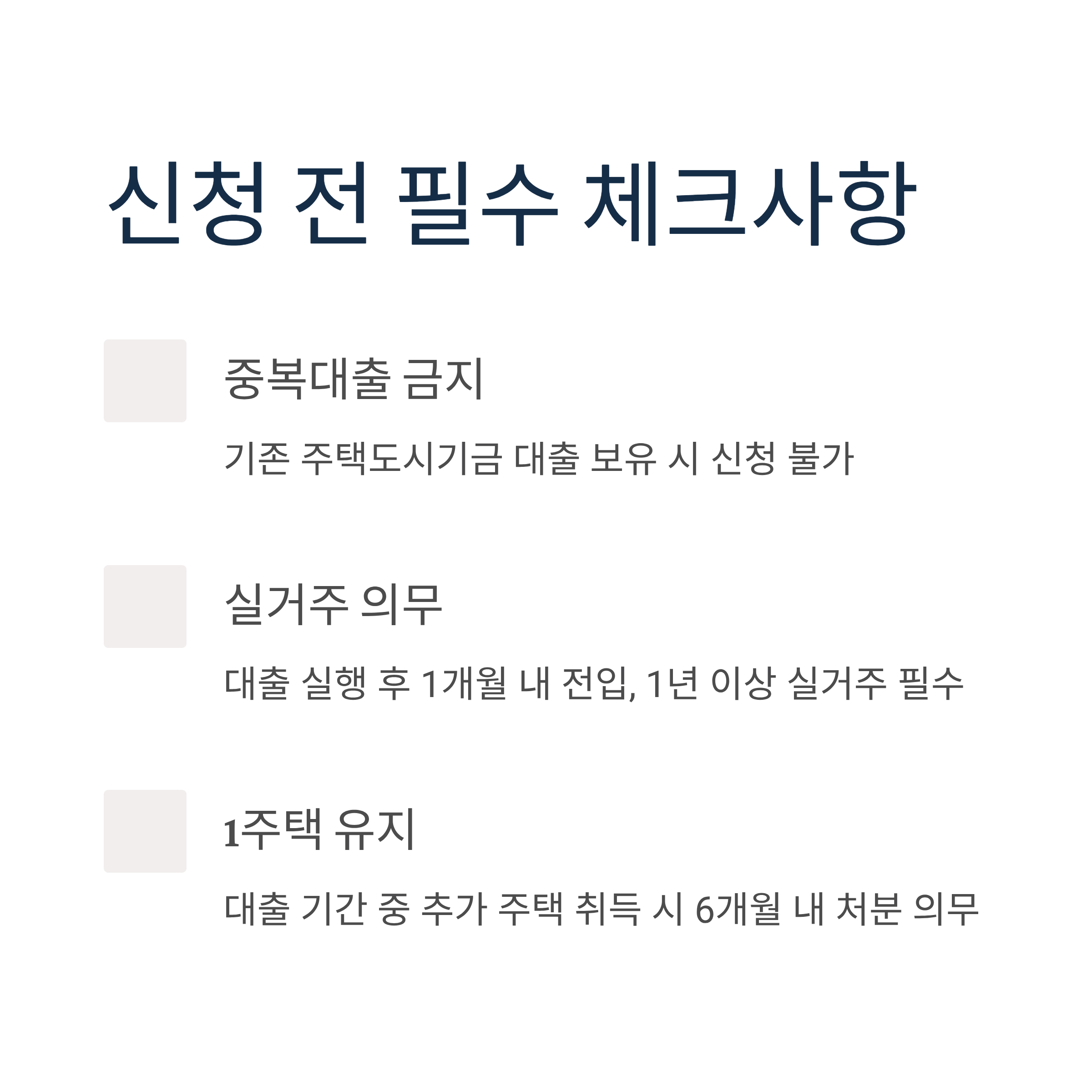 - 실거주 의무: 대출 실행 후 1개월 내 전입, 1년 이상 실거주 필수