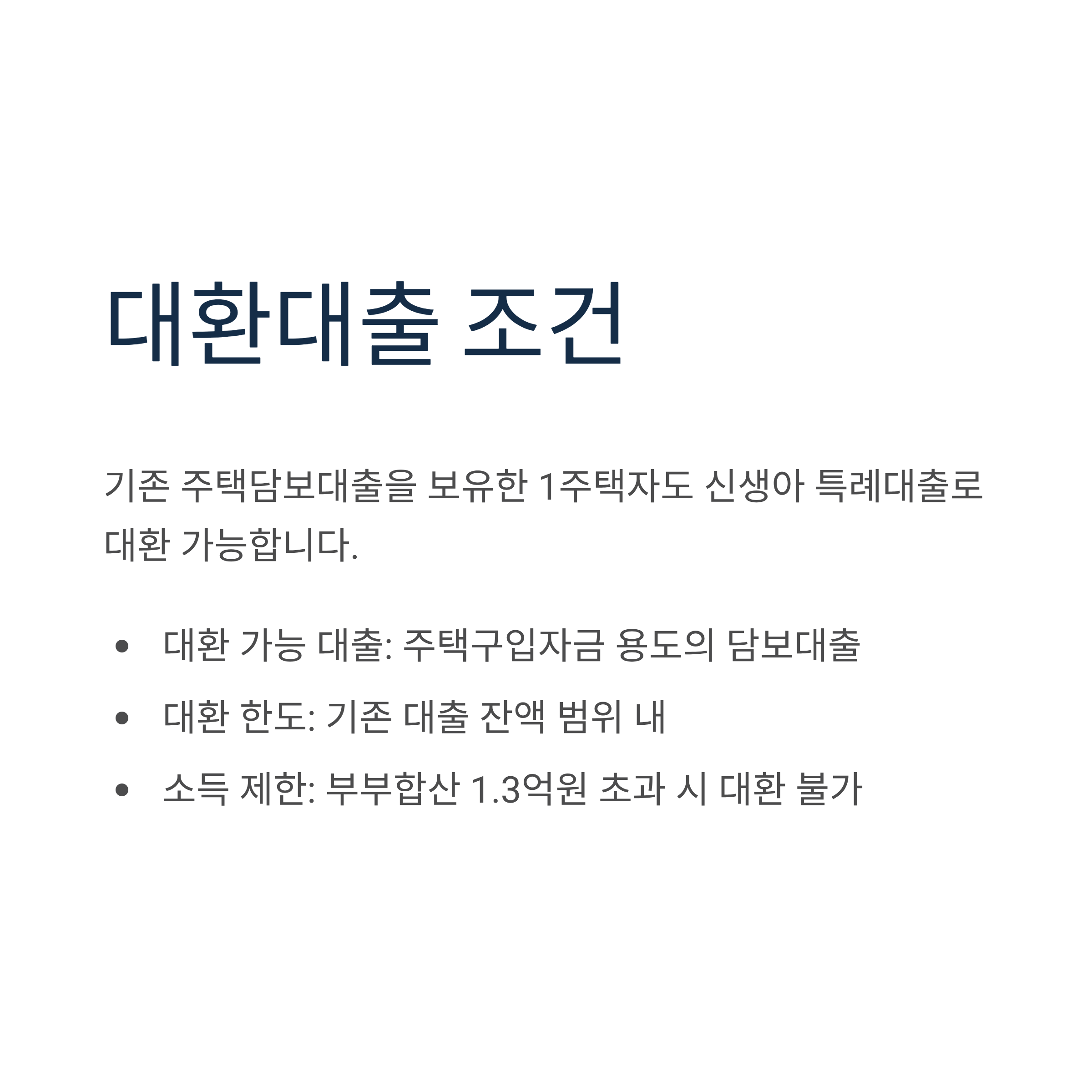 - 소득 제한: 부부합산 1.3억원 초과 시 대환 불가