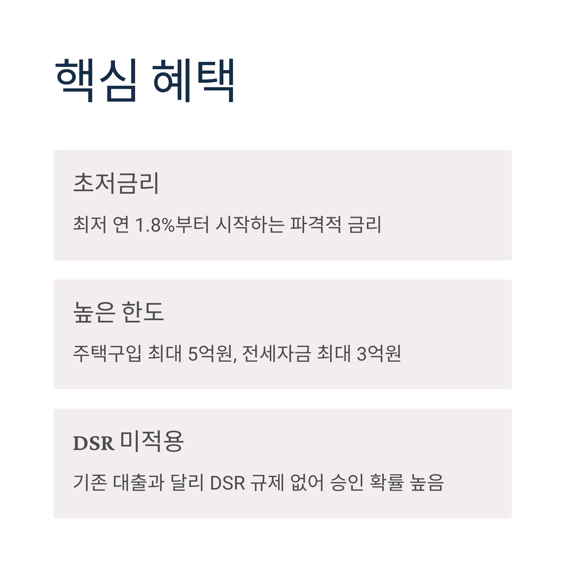 - DSR 미적용: 기존 대출과 달리 DSR 규제 없어 승인 확률 높음