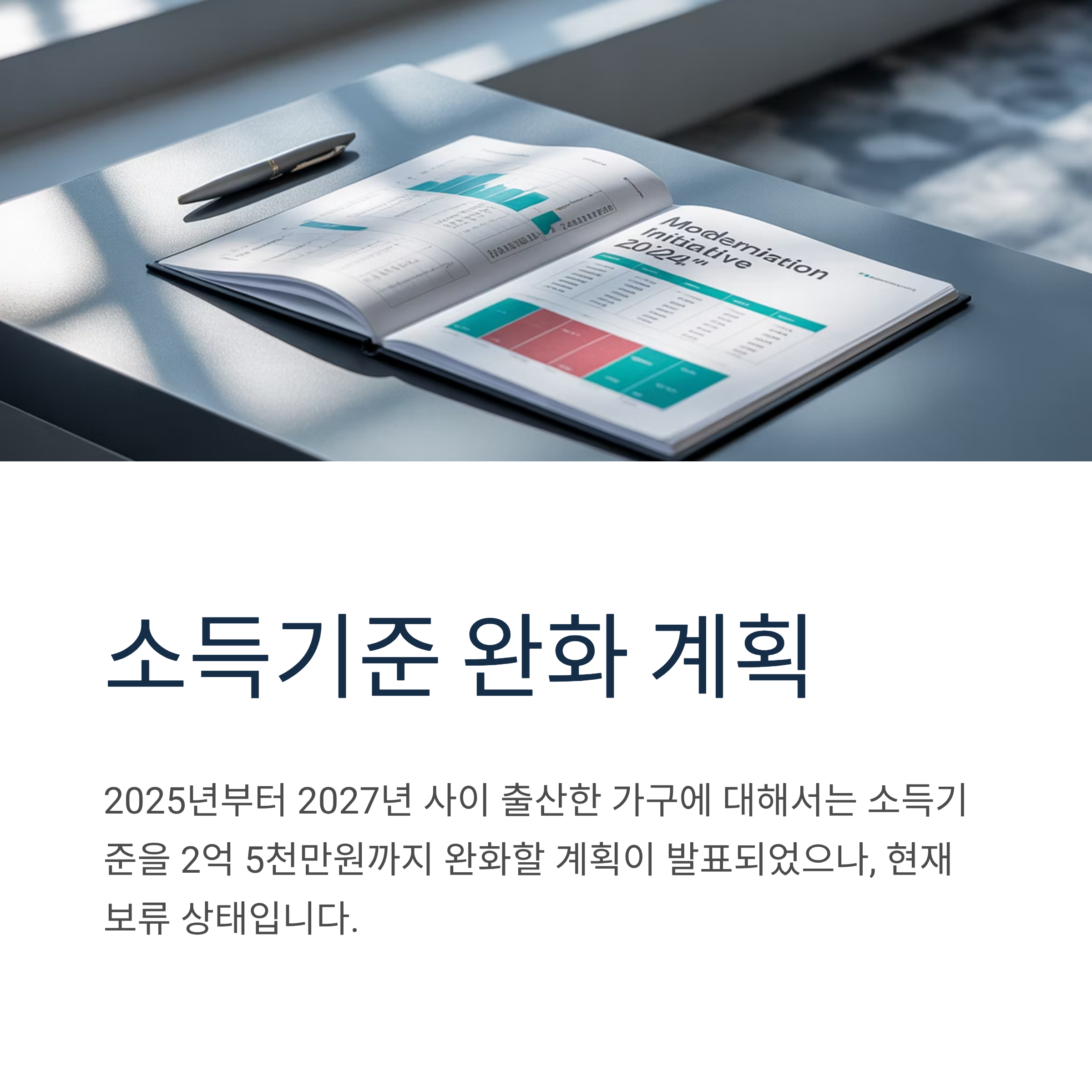 2025년부터 2027년 사이 출산한 가구에 대해서는 소득기준을 2억 5천만원까지 완화할 계획이 발표되었으나, 대출 규제 강화 기조에 따라 현재 보류된 상태입니다.