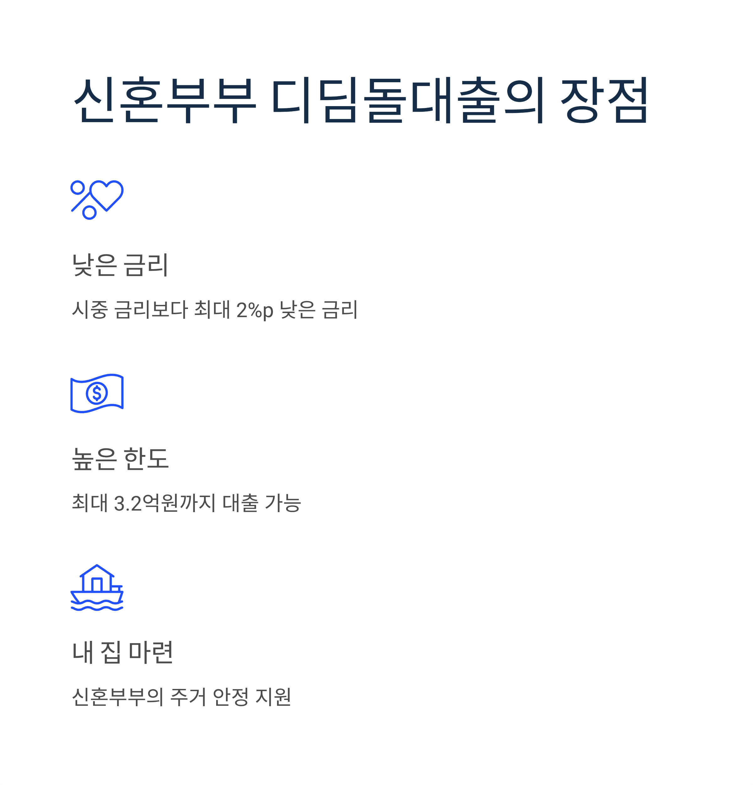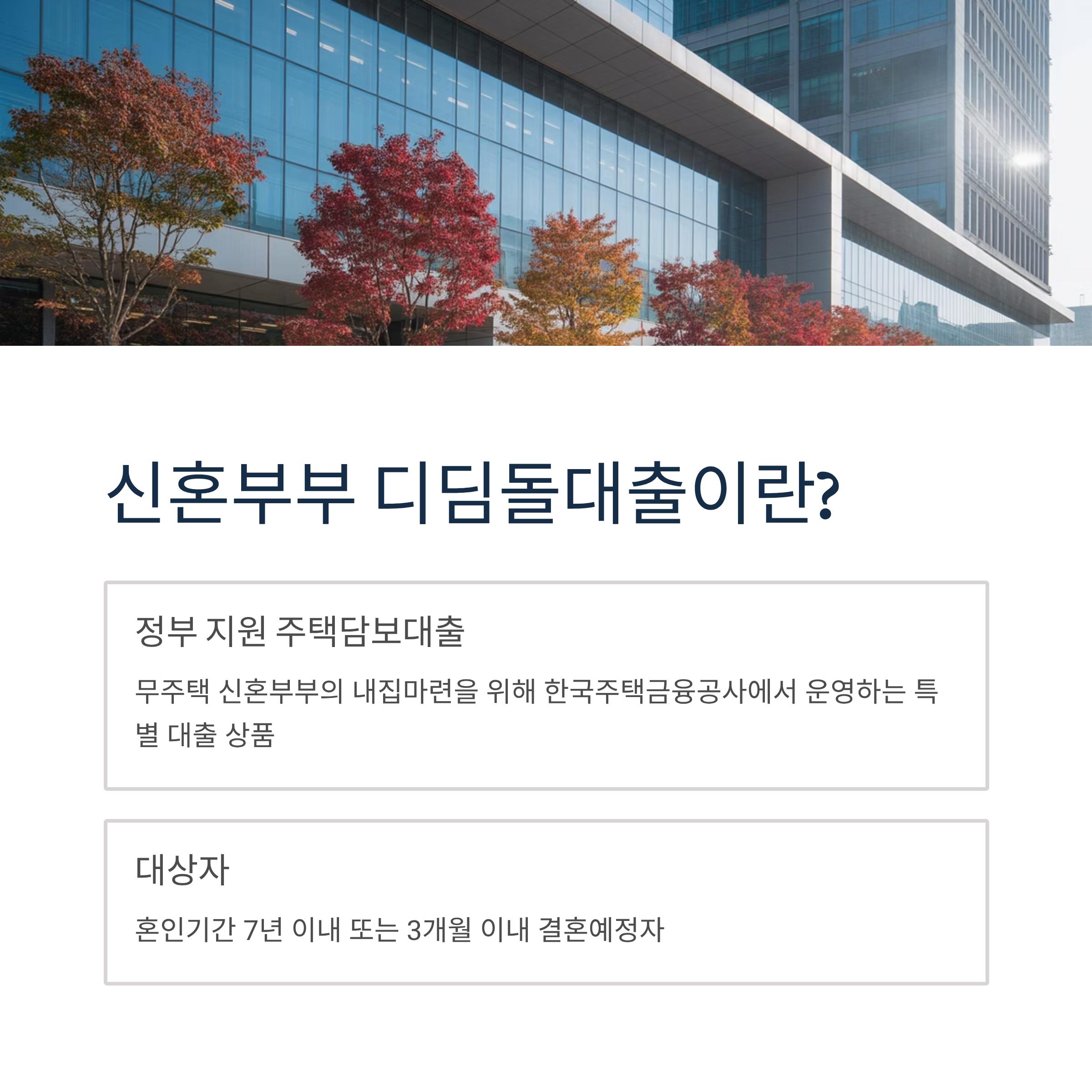 신혼부부 디딤돌대출은 정부가 무주택 신혼부부의 내집마련을 지원하기 위해 제공하는 주택담보대출 상품입니다. 한국주택금융공사에서 운영하며, 혼인기간 7년 이내 또는 3개월 이내 결혼예정자가 대상입니다.
