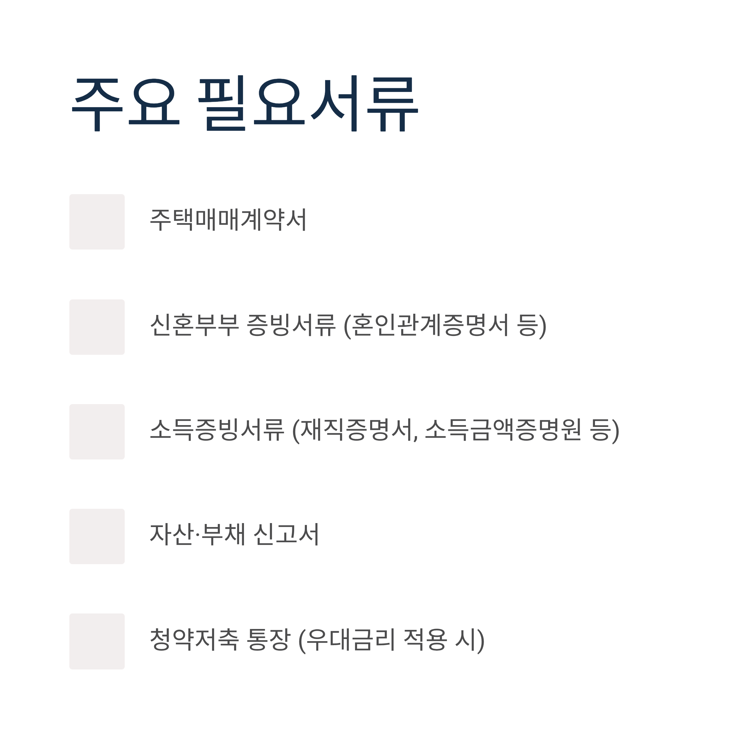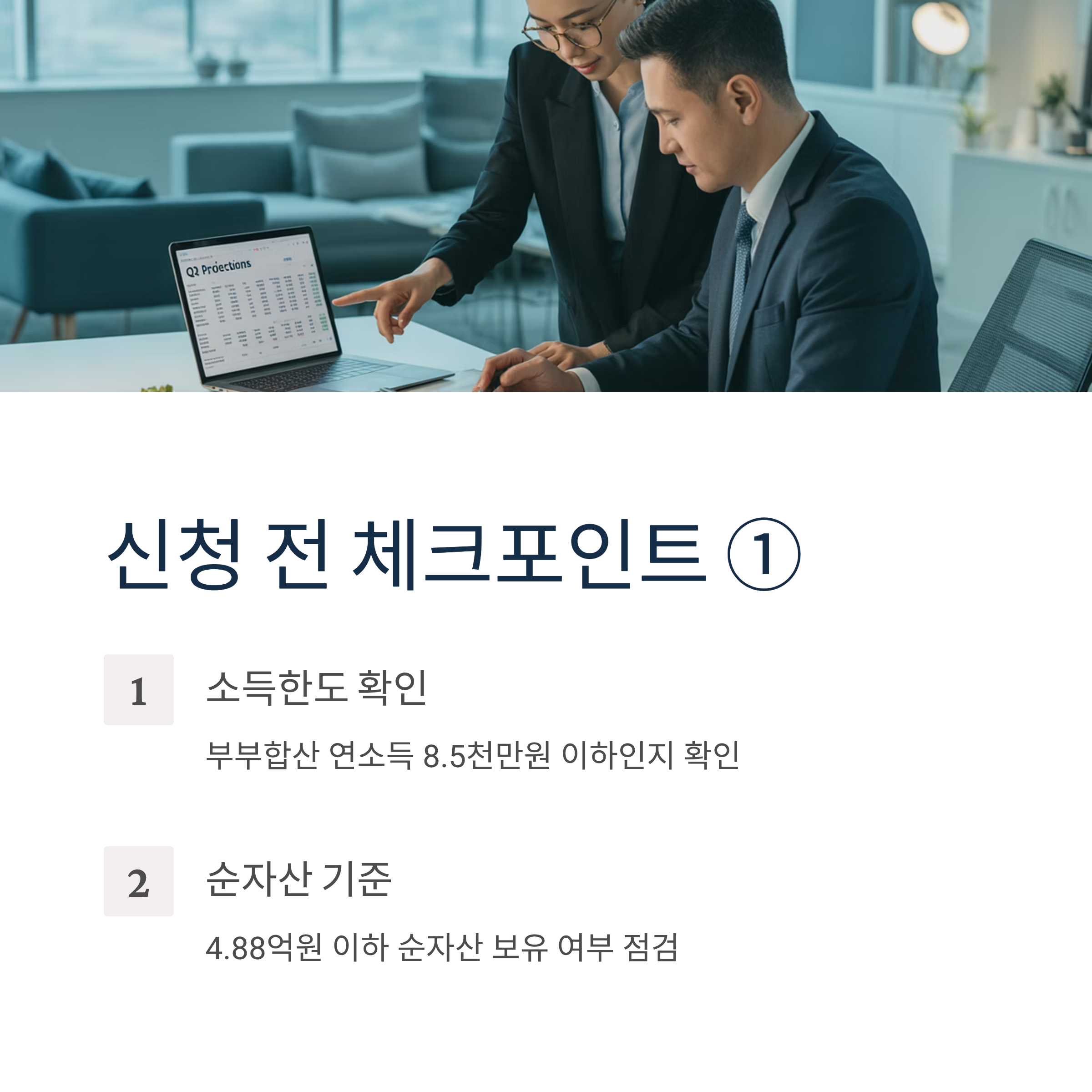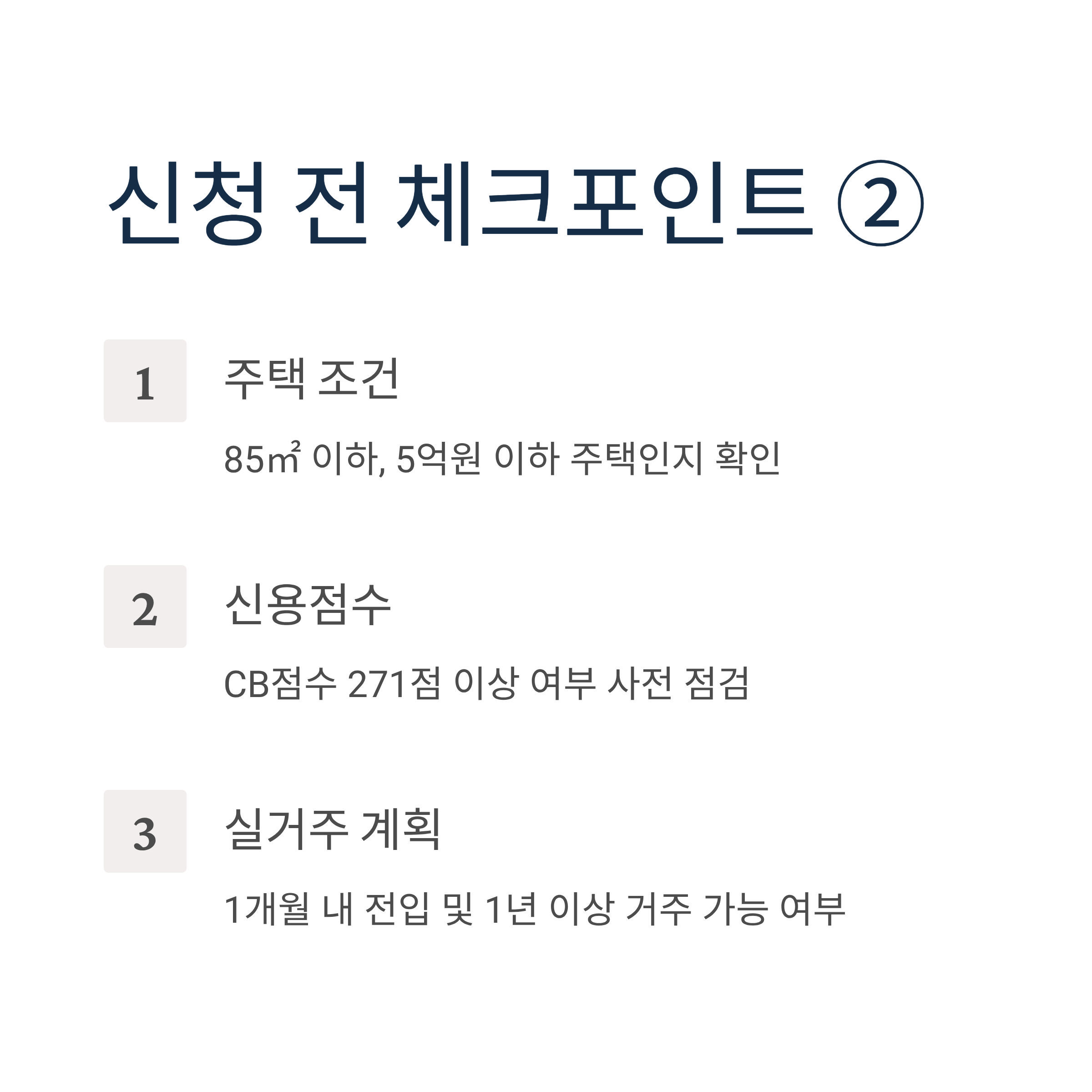 - 소득한도 확인: 부부합산 연소득 8.5천만원 이하인지 확인