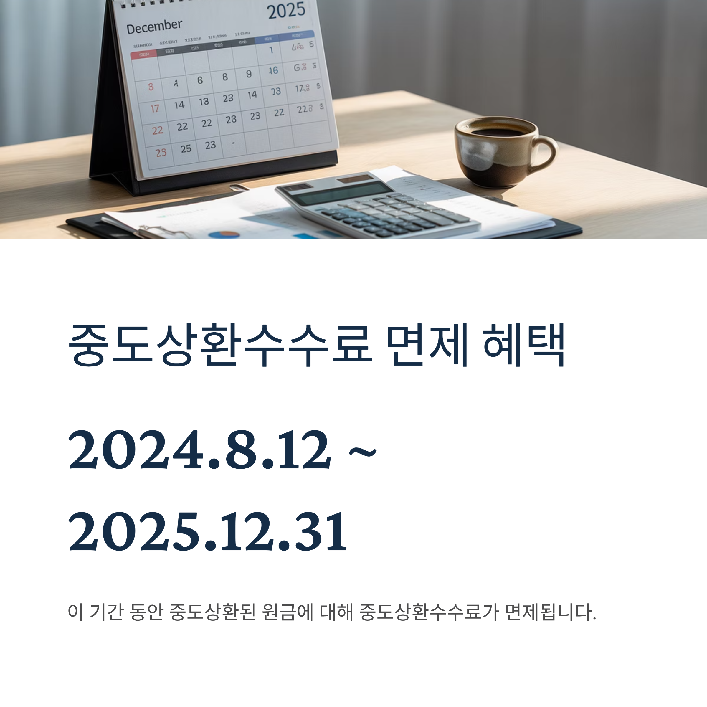 2024년 8월 12일부터 2025년 12월 31일까지 중도상환된 원금에 대해 중도상환수수료가 면제됩니다. 이는 신혼부부에게 상당한 혜택이 될 수 있습니다.