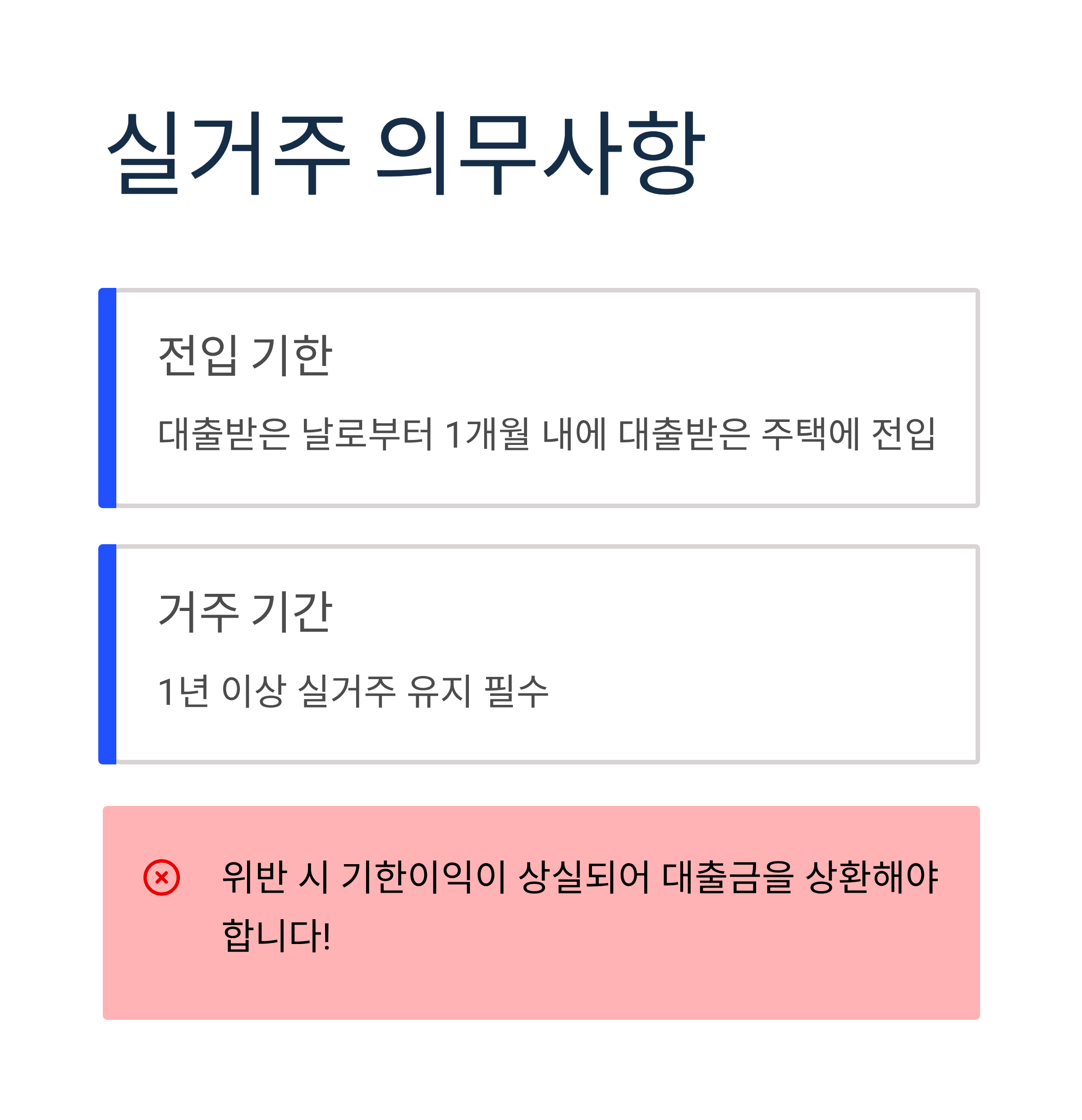 ⚠️ 중요사항: 대출받은 날로부터 1개월 내에 대출받은 주택에 전입 후 1년 이상 실거주를 유지해야 합니다. 정당한 사유 없이 이를 위반할 경우 기한이익이 상실되어 대출금을 상환해야 하므로 주의가 필요합니다.
