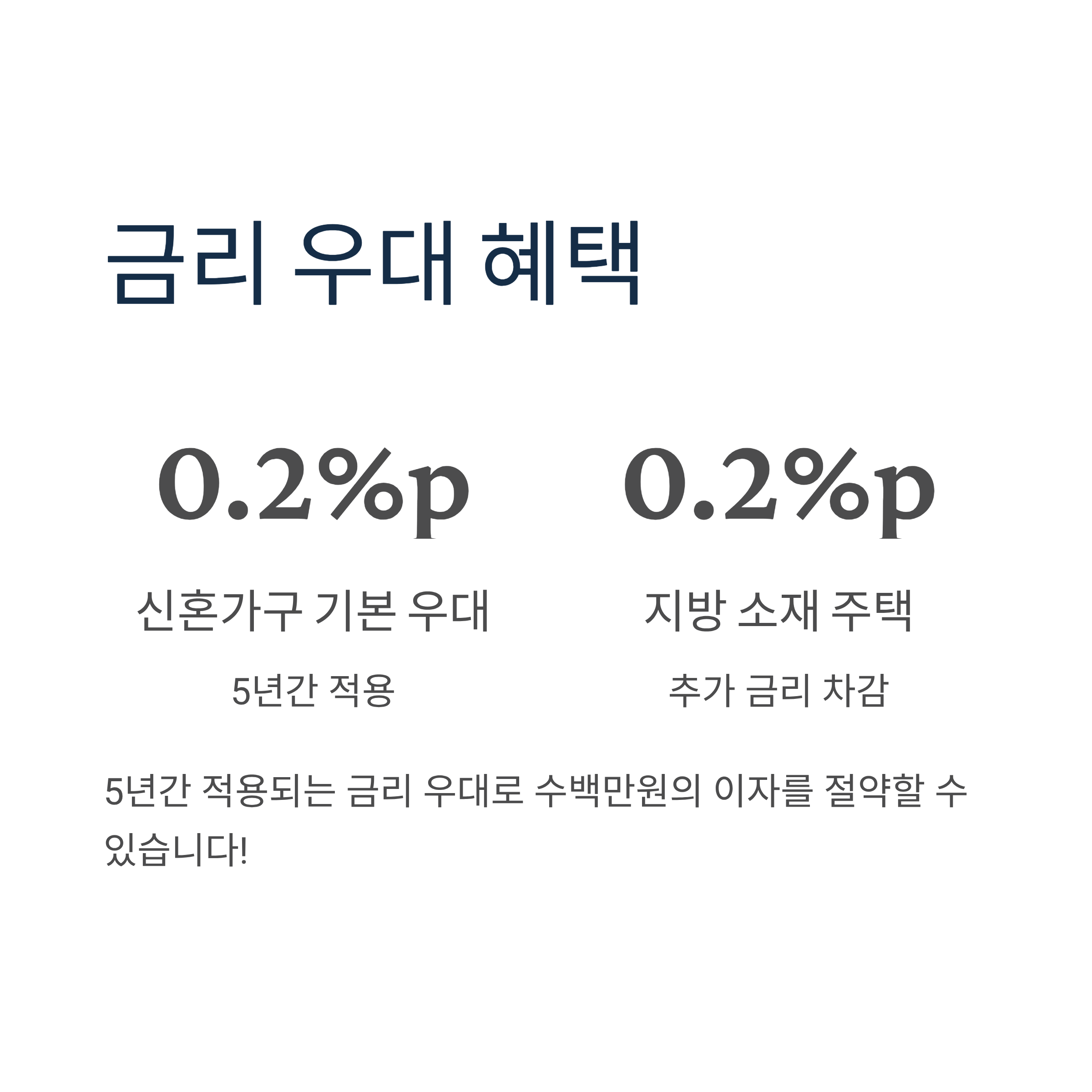 신혼가구는 기본금리에서 연 0.2%p 우대금리를 5년간 적용받습니다.