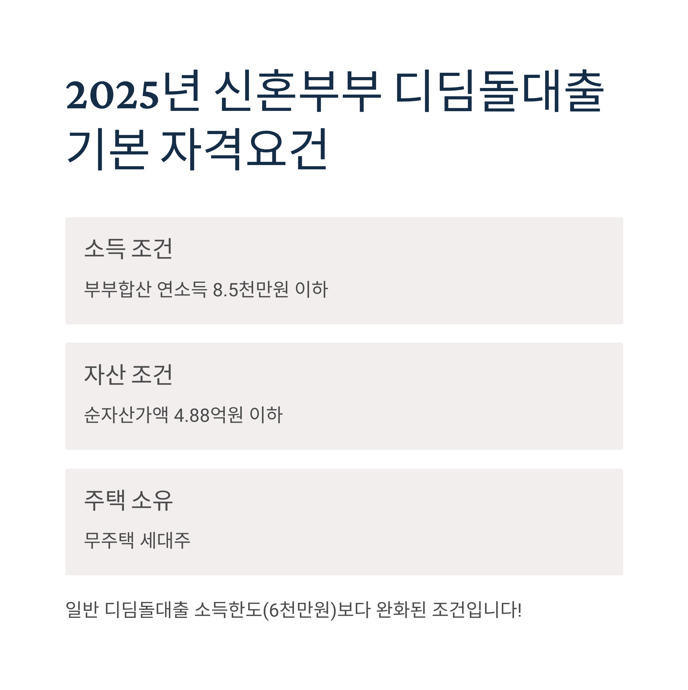 부부합산 연소득 8.5천만원 이하이면서 순자산가액 4.88억원 이하인 무주택 세대주여야 합니다. 일반 디딤돌대출의 소득한도가 6천만원인 것과 비교하면 상당히 완화된 조건입니다.