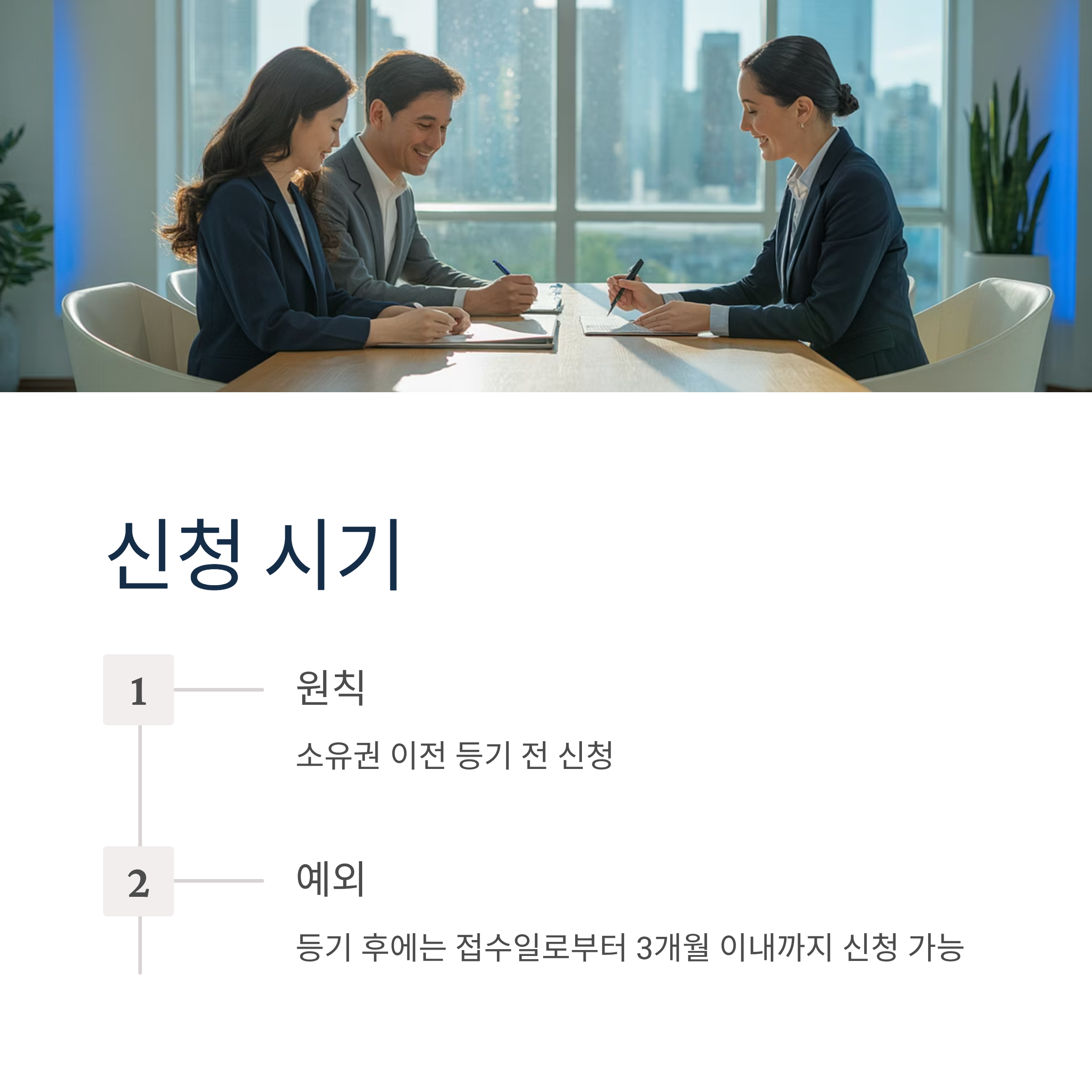 원칙적으로 소유권 이전 등기 전에 신청해야 하며, 등기 후에는 접수일로부터 3개월 이내까지 신청 가능합니다.