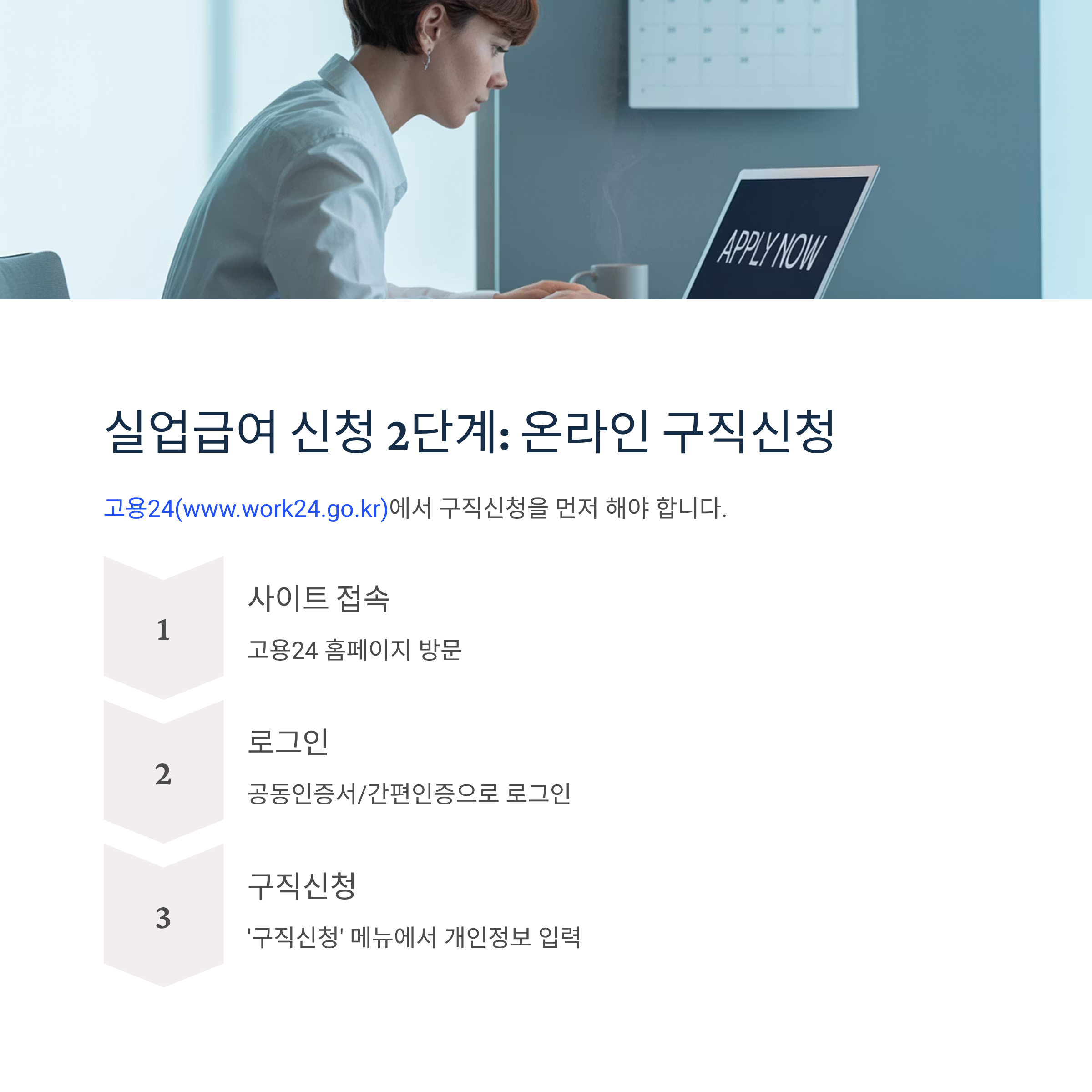 고용24(www.work24.go.kr)에서 구직신청을 먼저 해야 합니다. 이는 실업급여 신청의 전제 조건입니다.