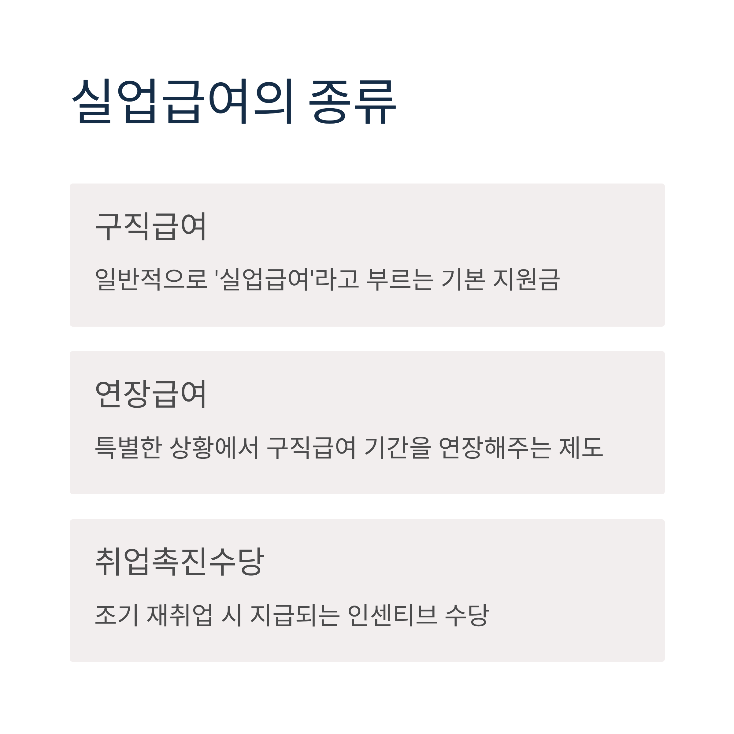실업급여의 종류는 크게 구직급여, 연장급여, 취업촉진수당으로 나누어지며, 일반적으로 우리가 말하는 '실업급여'는 구직급여를 의미합니다.