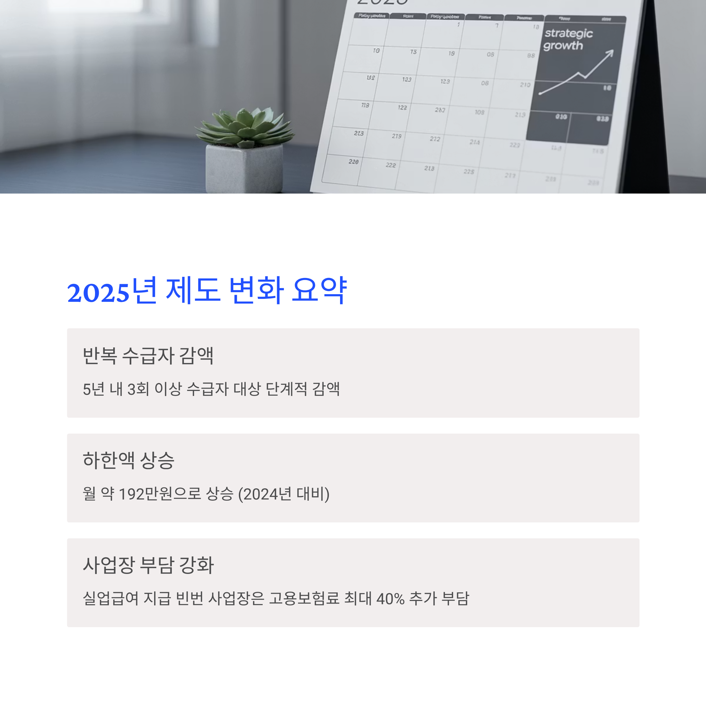 2025년부터 반복 수급자에 대한 지급액 감액 규정이 신설되었습니다. 최근 5년 이내에 3회 이상 실업급여를 수급한 구직자 대상으로 지급액이 단계적으로 감액됩니다.