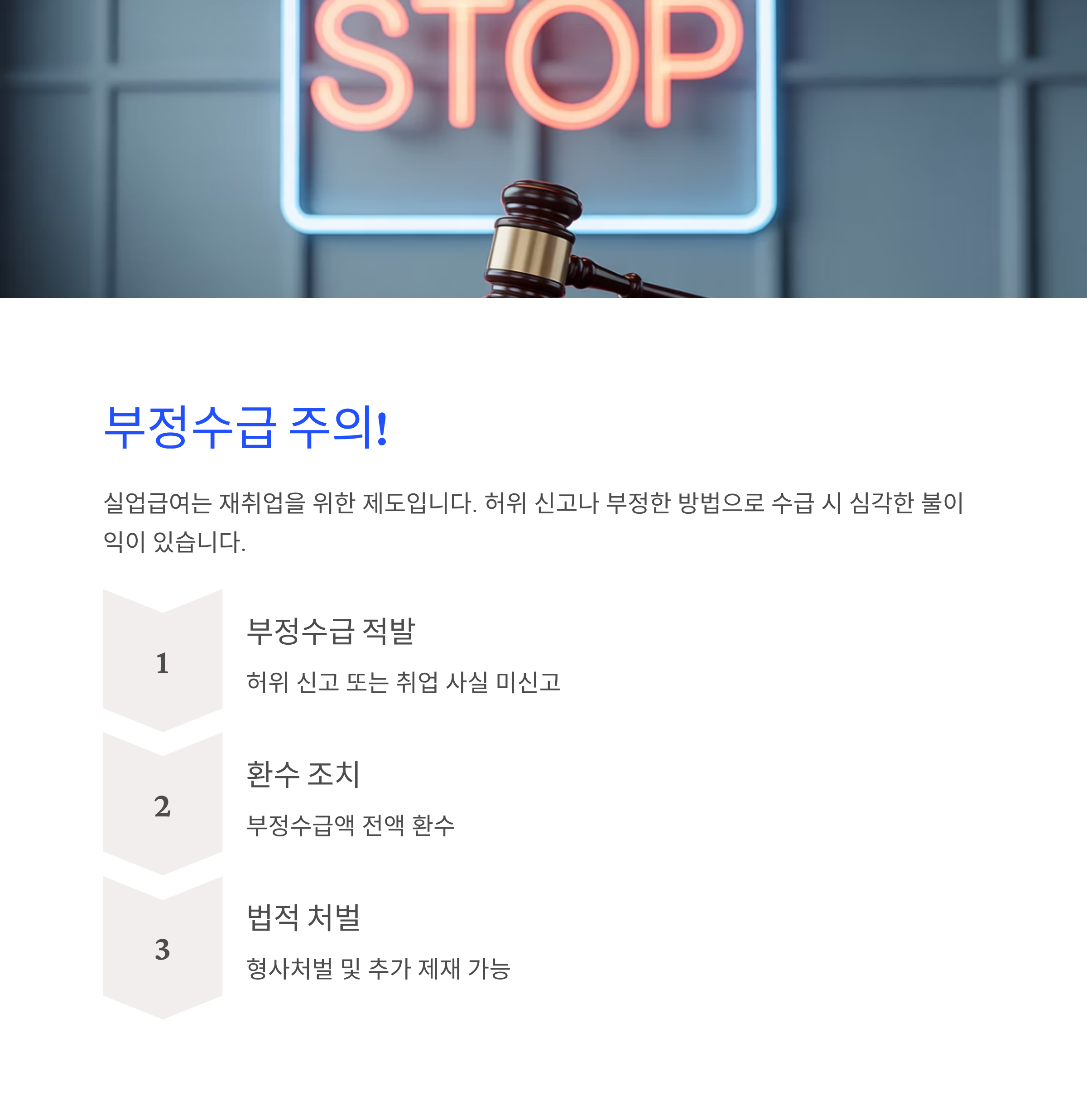 실업급여는 재취업을 위한 제도이므로, 허위 신고나 부정한 방법으로 수급할 경우 환수 조치와 함께 법적 처벌을 받을 수 있습니다.