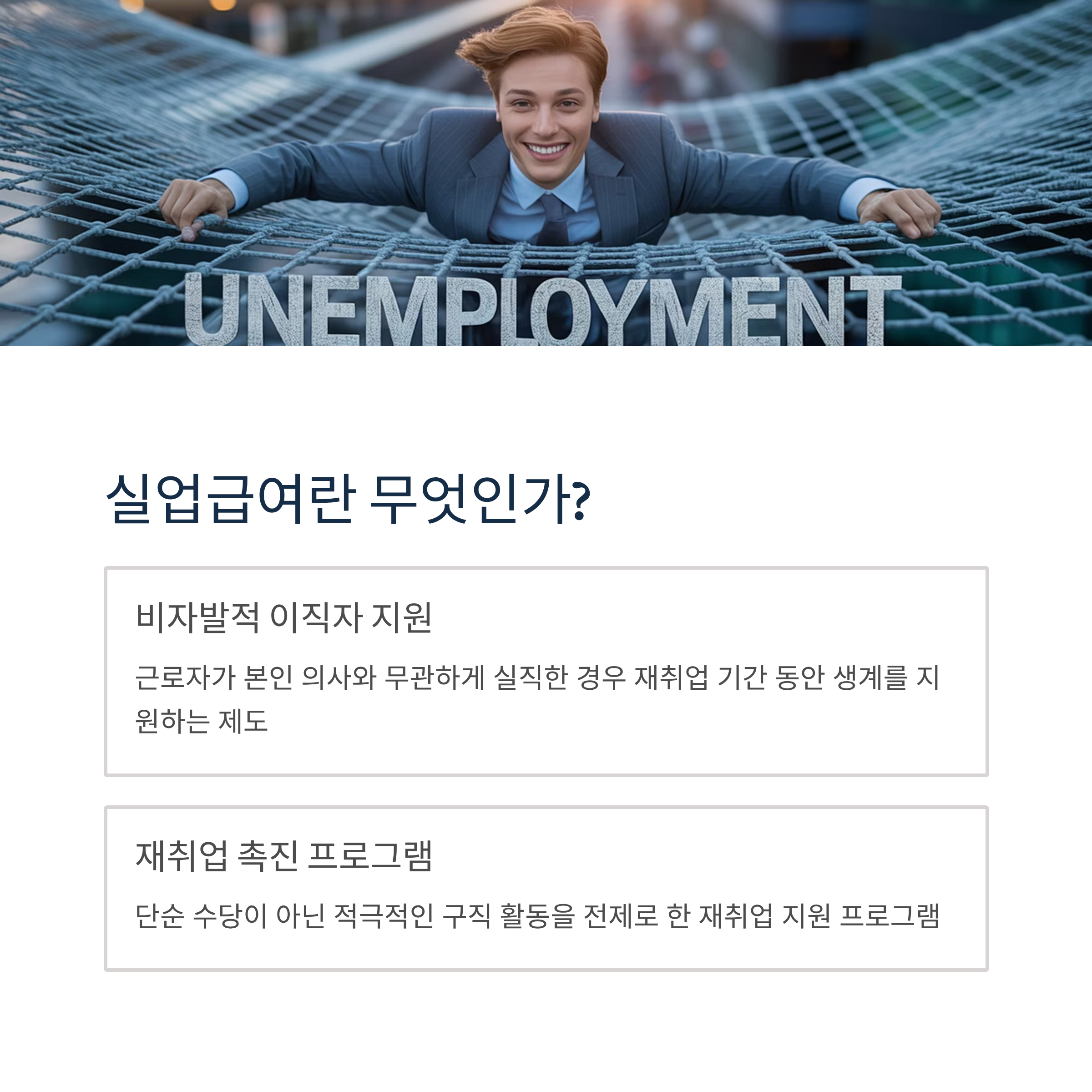 실업급여는 근로자가 비자발적으로 이직한 경우 재취업 기간 동안 정부가 생계를 지원하고 재취업을 돕기 위한 제도입니다. 단순히 실업 수당이 아니라, 적극적인 구직 활동을 전제로 한 재취업 지원 프로그램입니다.