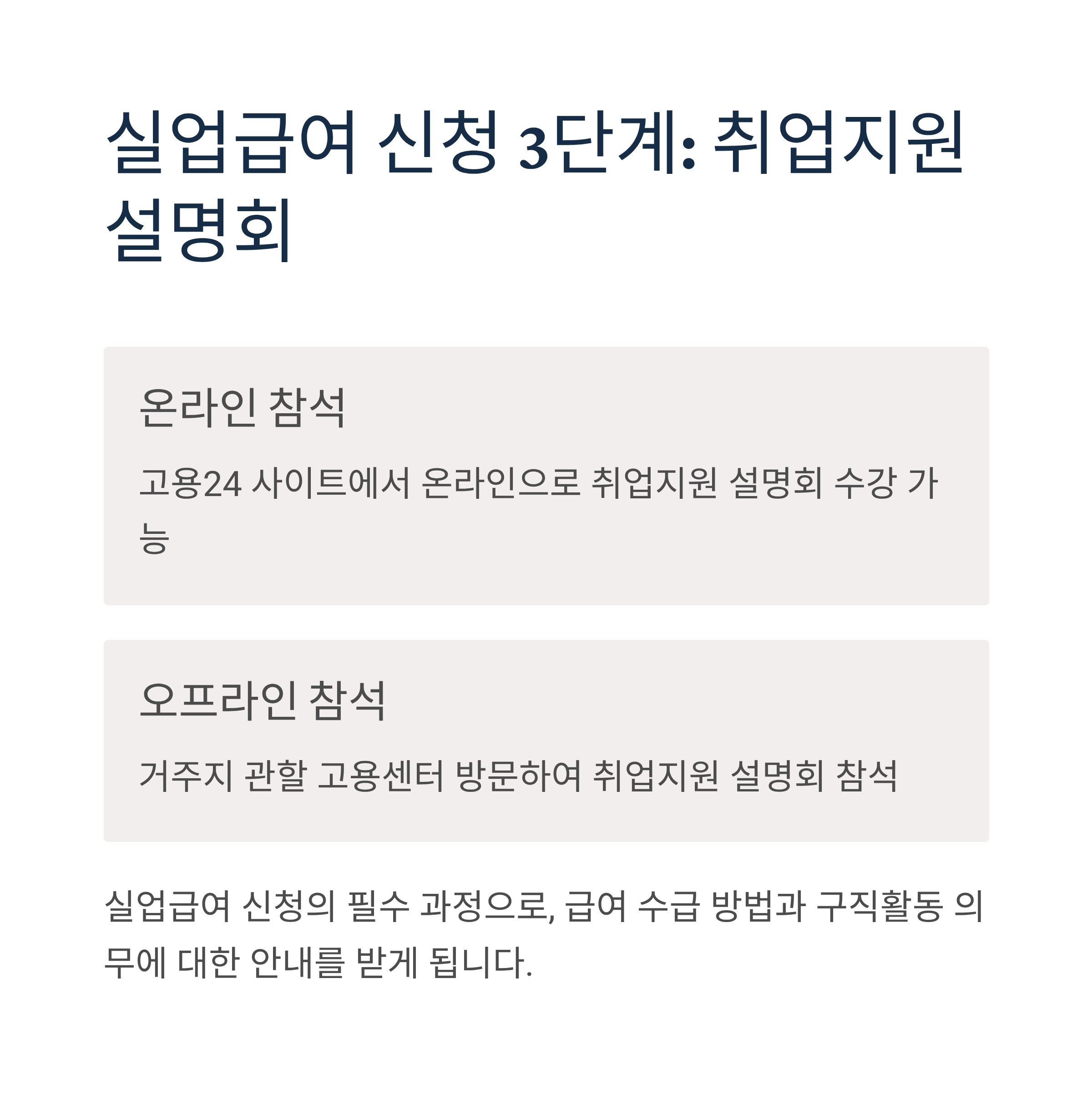 실업급여 신청자 취업지원 설명회 참석: 온라인 또는 거주지 관할 고용센터 방문하여 수강해야 합니다. 온라인으로도 가능하므로 편리한 방법을 선택하세요.