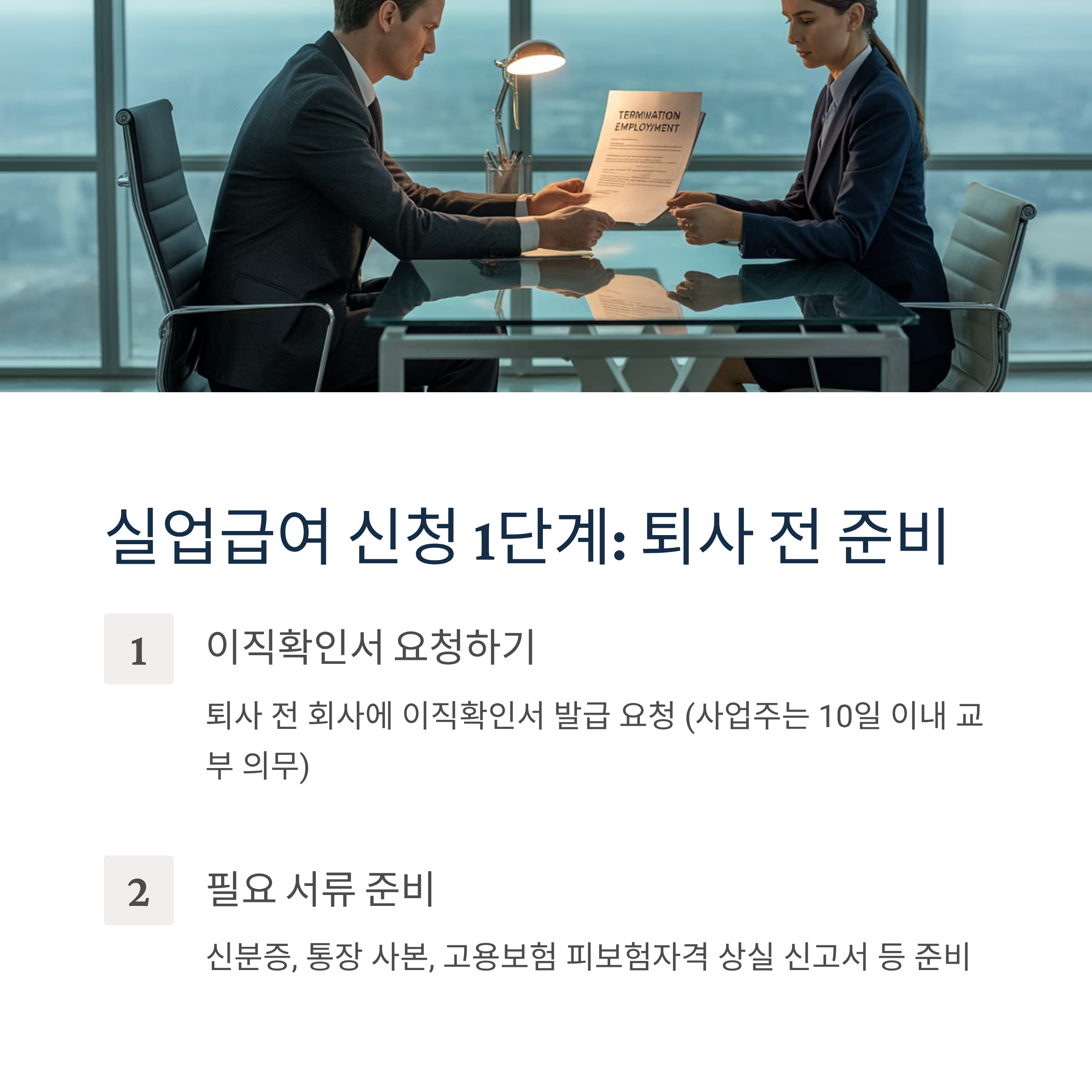 이직확인서 요청이 가장 중요합니다. 실업급여 자격 판단에 필수적인 서류로 퇴사한 근로자가 요청하면 사업주는 10일 이내에 신고(교부)하여야 합니다.