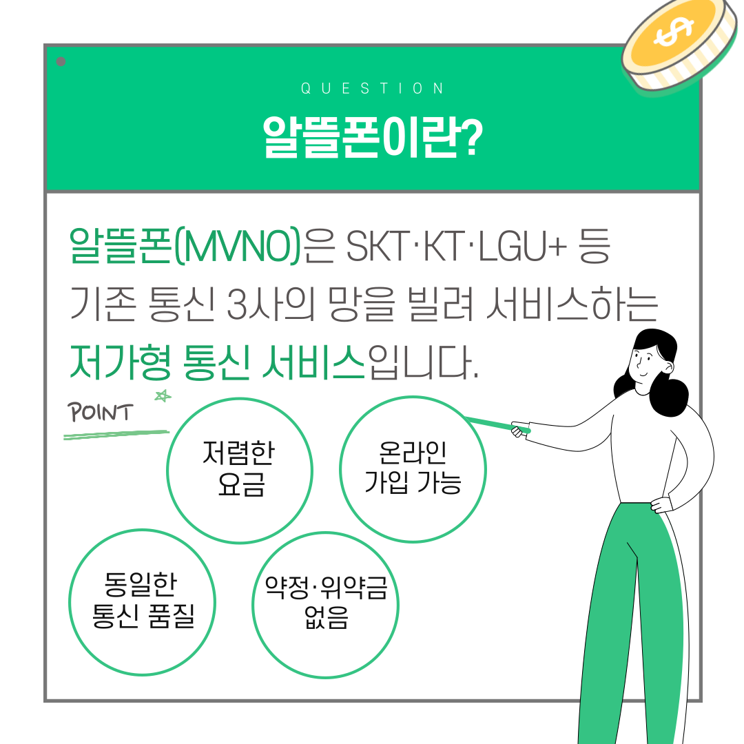 알뜰폰(MVNO)은 SKT·KT·LGU+ 등 기존 통신 3사의 망을 빌려 서비스하는 저가형 통신 서비스입니다.