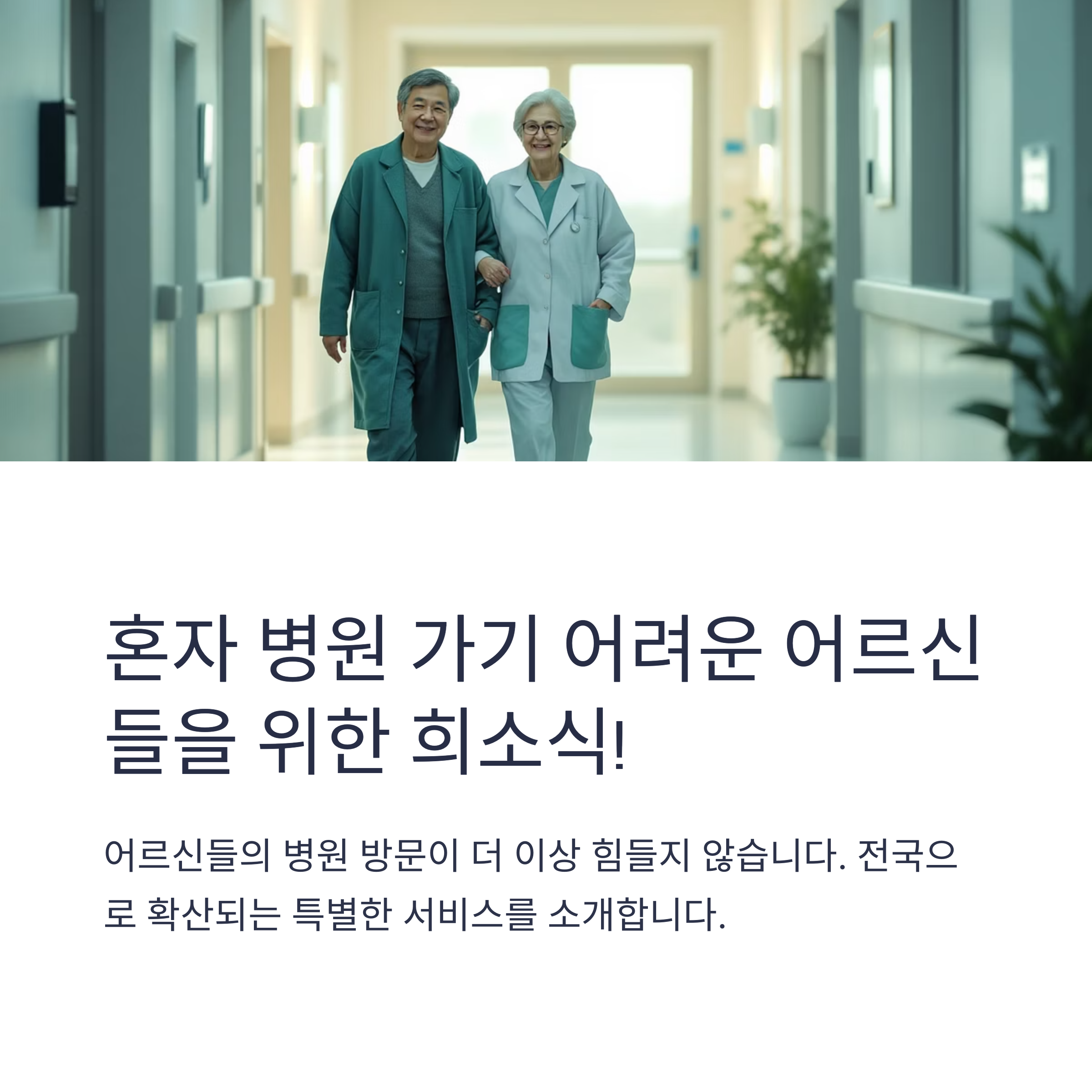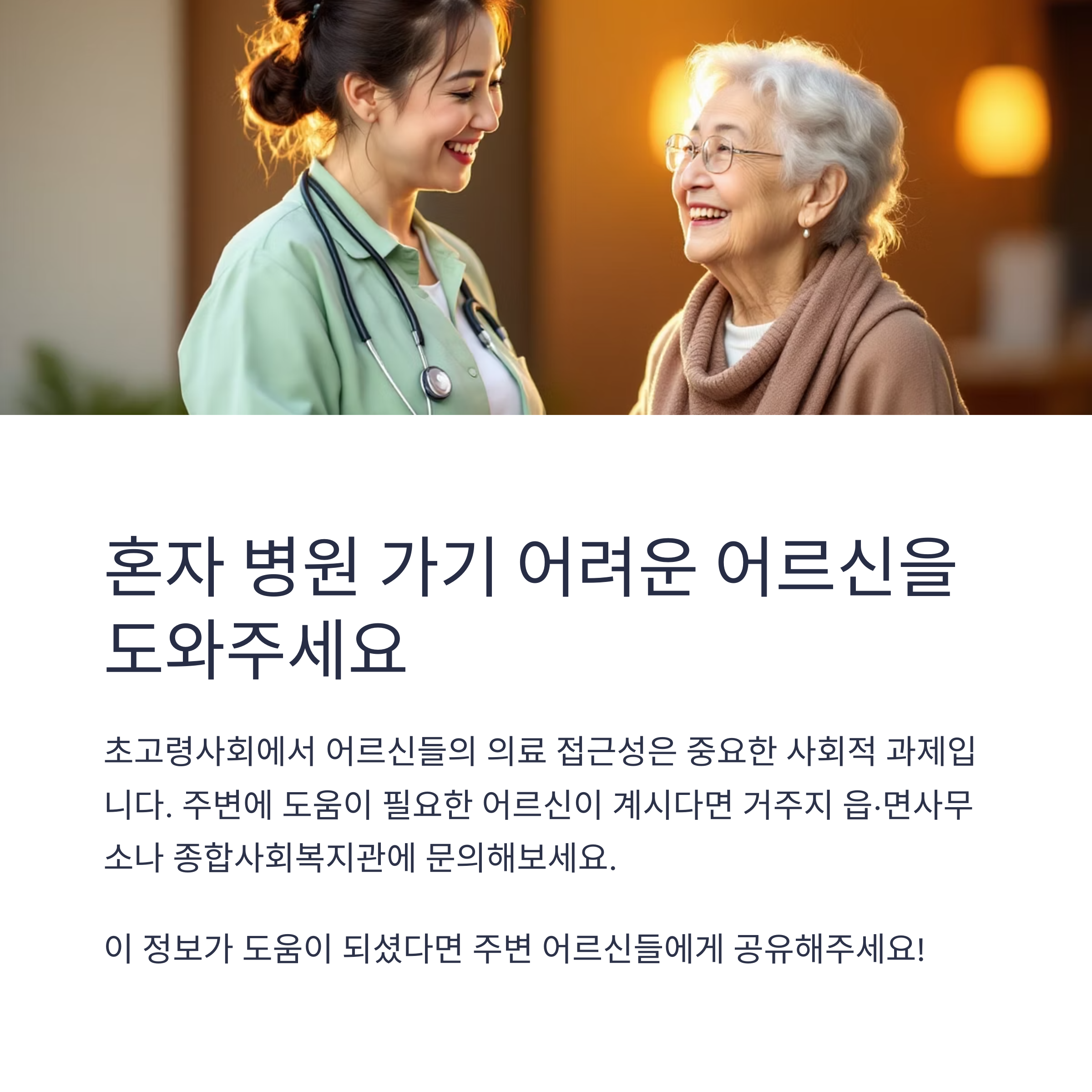 초고령사회 진입과 함께 어르신들의 의료 접근성 문제가 사회적 과제로 대두되고 있는 상황에서, 어르신 병원 동행 서비스는 매우 의미 있는 공공 서비스입니다. 혼자 병원 가기 어려운 어르신이나 가족이 계시다면, 거주지 읍·면사무소나 종합사회복지관에 문의하여 서비스 이용을 검토해보시기 바랍니다.