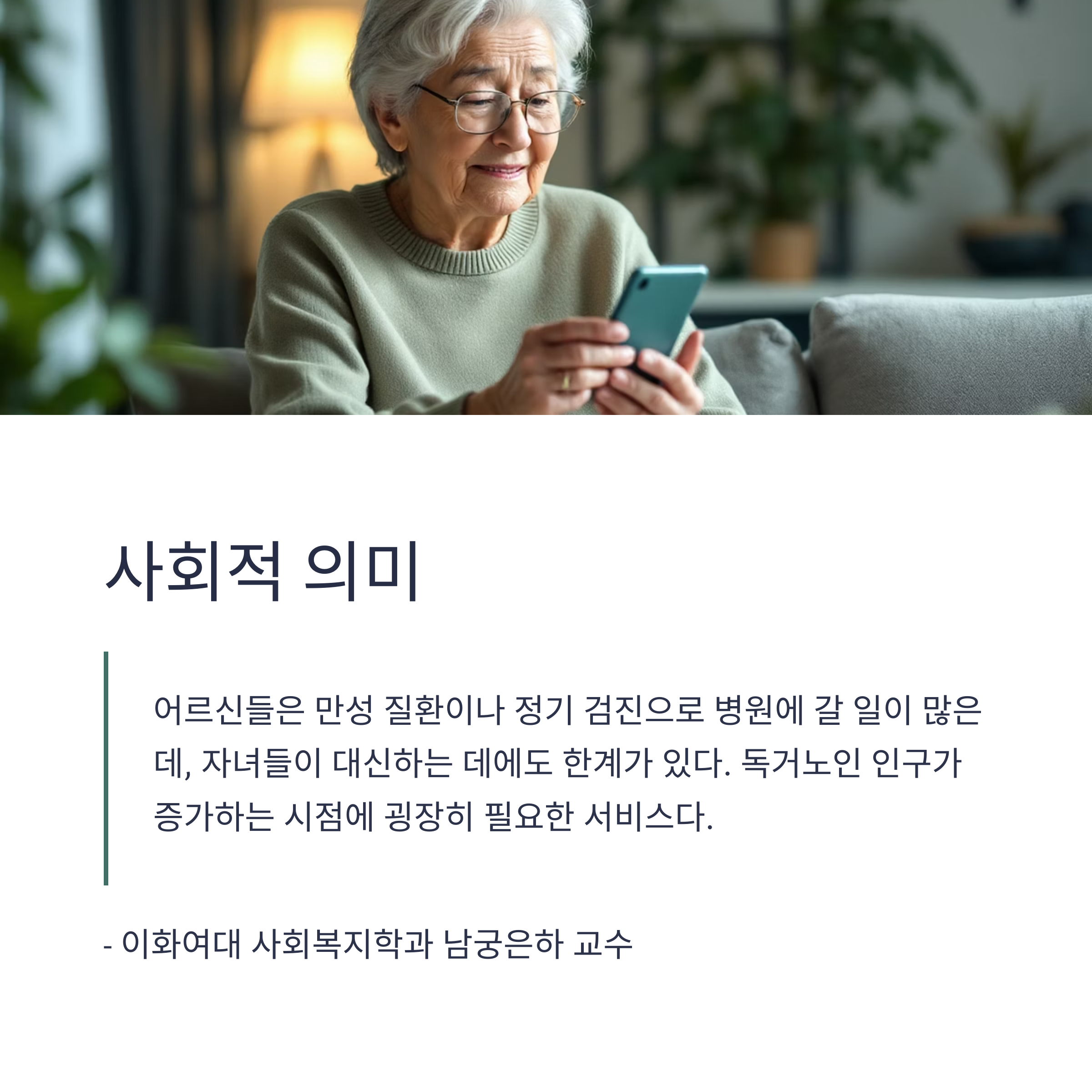 이화여대 사회복지학과 남궁은하 교수는 "어르신들은 만성 질환이나 정기 검진으로 병원에 갈 일이 많은데, 자녀들이 대신하는 데에도 한계가 있다"며 "독거노인 인구가 증가하는 시점에 굉장히 필요한 서비스"라고 평가했습니다.