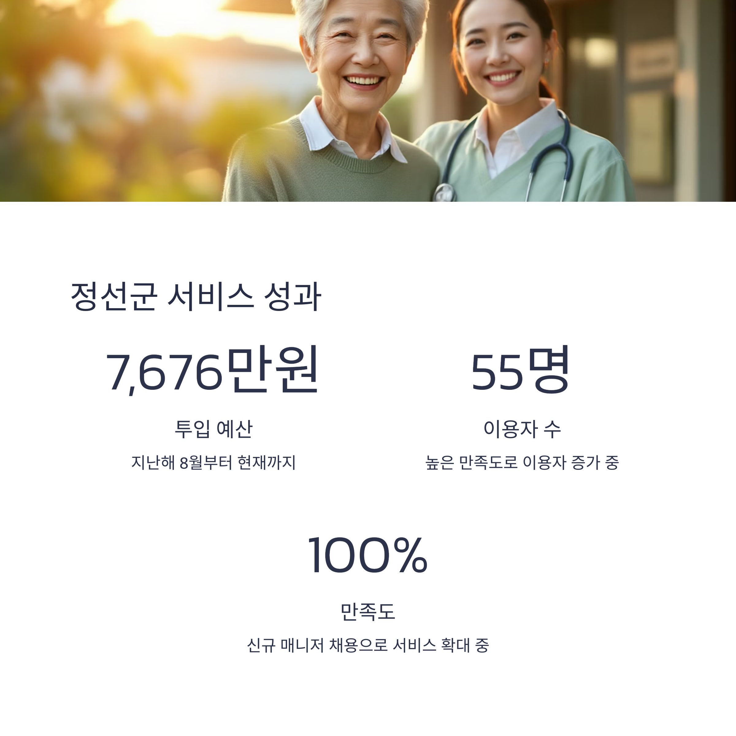 정선군의 경우 지난해 8월부터 서비스를 시작해 현재까지 7,676만원의 예산을 투입했으며, 이용자 만족도가 매우 높아 서비스 확대를 위해 신규 매니저 채용도 진행하고 있습니다. 각 지역별 행정센터에서 서비스 가능여부를 체크한 후 신청가능합니다.
