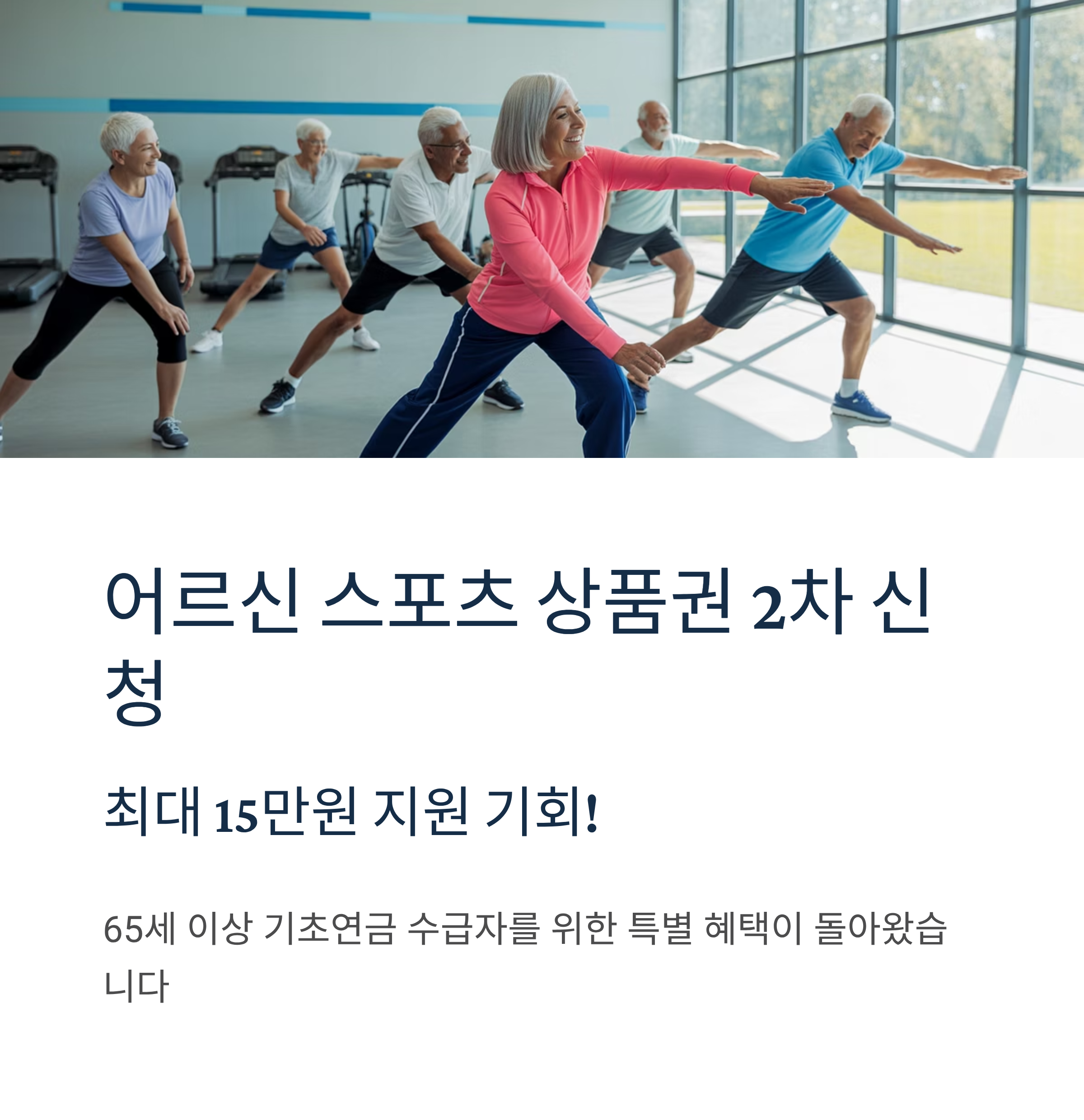 65세 이상 기초연금 수급 어르신이라면 누구나 신청할 수 있는 이 혜택을 통해 건강한 운동 습관을 시작하고, 지역 스포츠시설을 이용하며 활기찬 노후를 보내시기 바랍니다.
