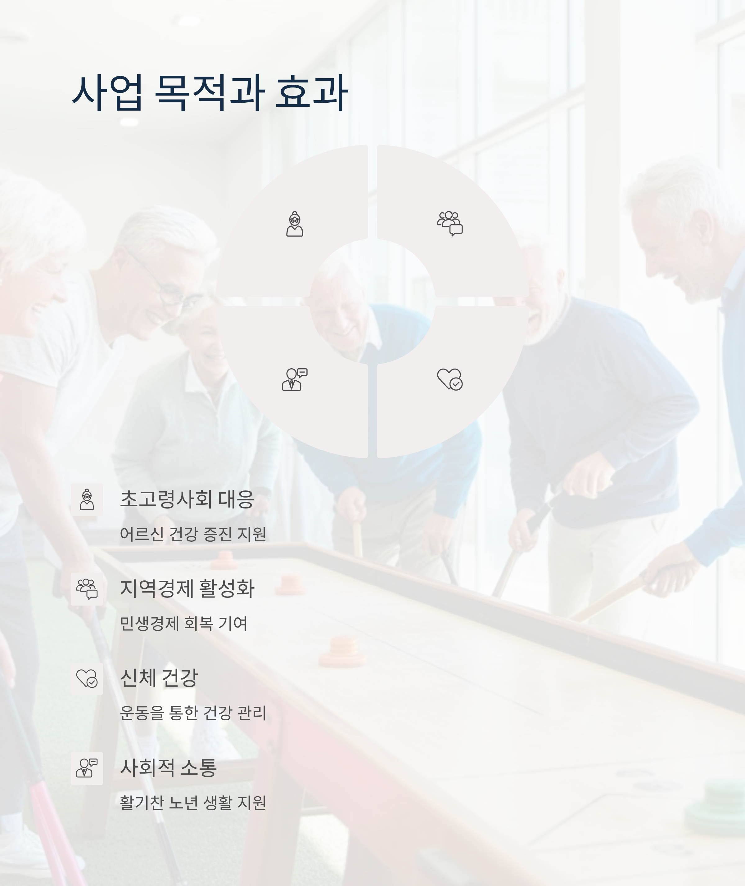 이번 사업은 초고령사회 진입에 대응해 어르신의 건강을 증진하고, 지역과 민생경제를 활성화하고자 새 정부 2025년 2차 추가경정예산(총사업비 365억 원, 국비 260억 원, 지방비 105억 원)으로 추진하는 사업입니다.