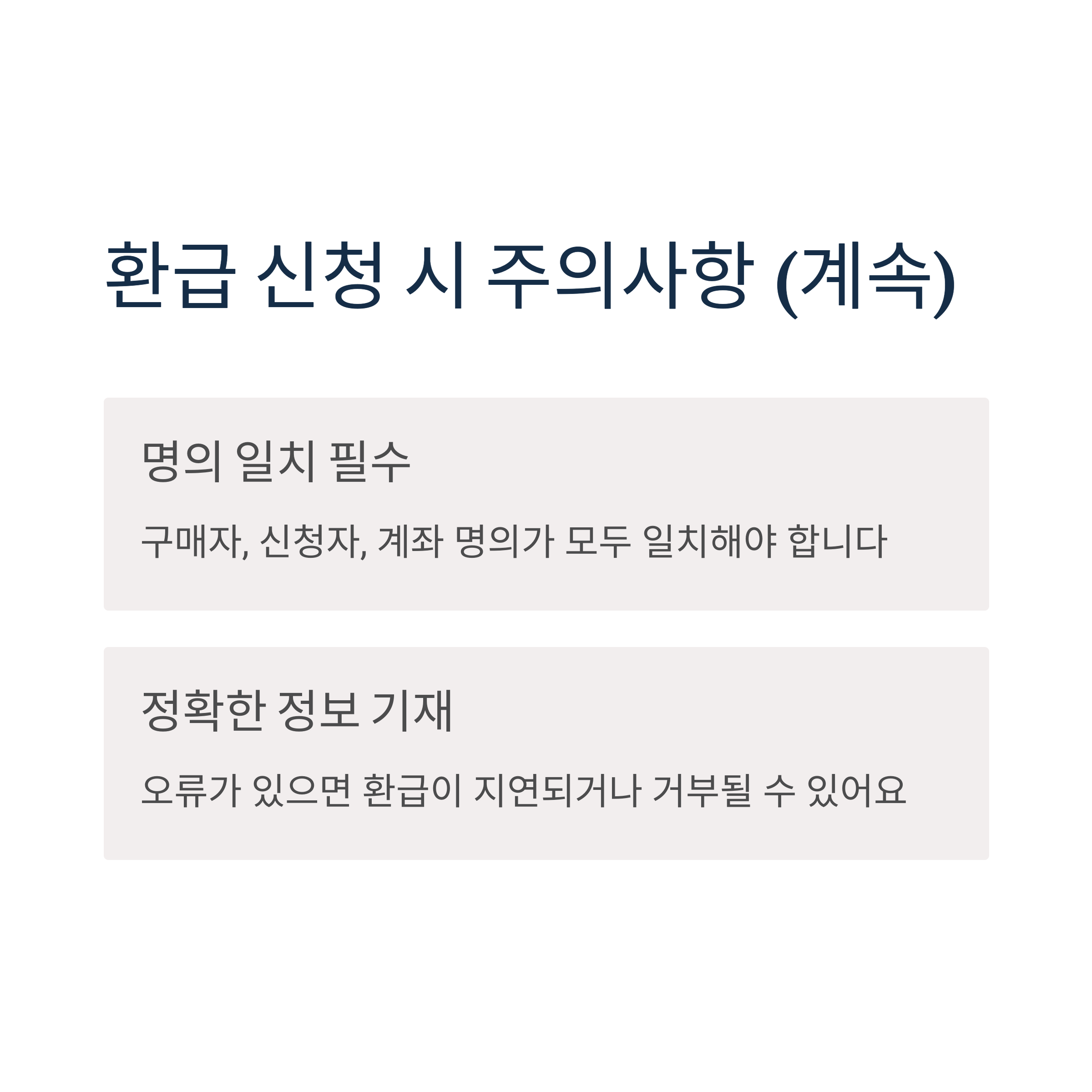 - 명의 일치: 구매자와 환급 신청자, 그리고 환급받을 계좌의 명의가 모두 일치해야 합니다.