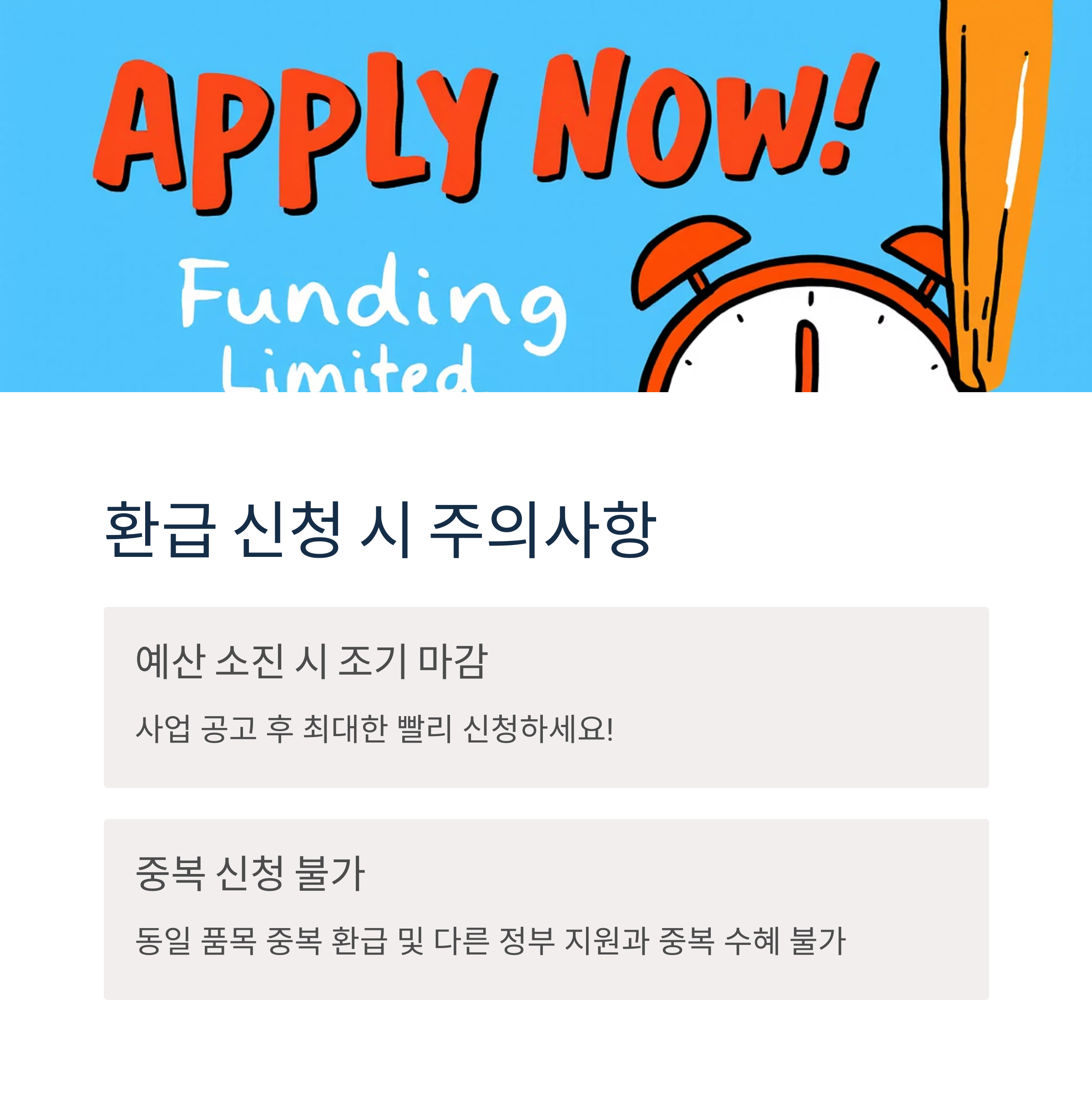 - 예산 소진 시 조기 마감: 환급 사업은 예산이 한정되어 있어, 예산 소진 시 조기 마감될 수 있습니다.