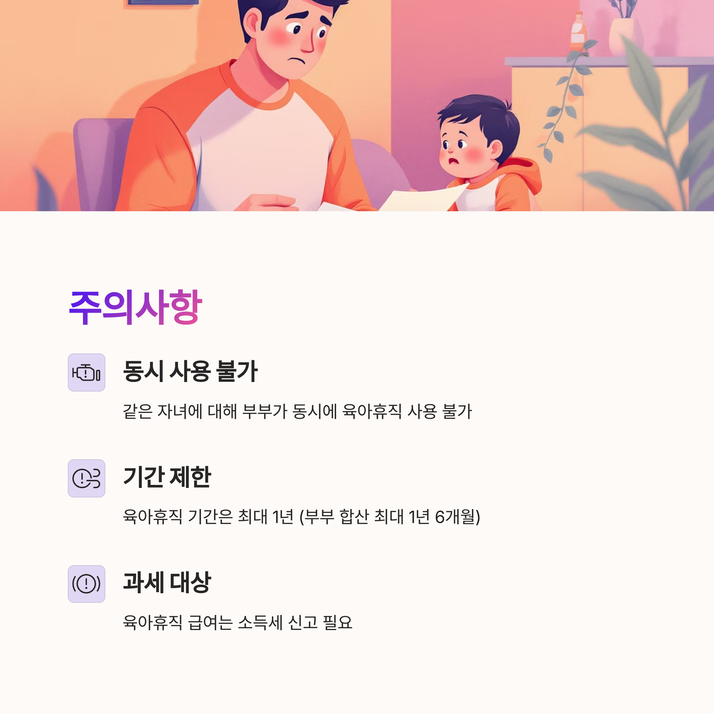 • 같은 자녀에 대해 부부가 동시에 육아휴직 사용 불가