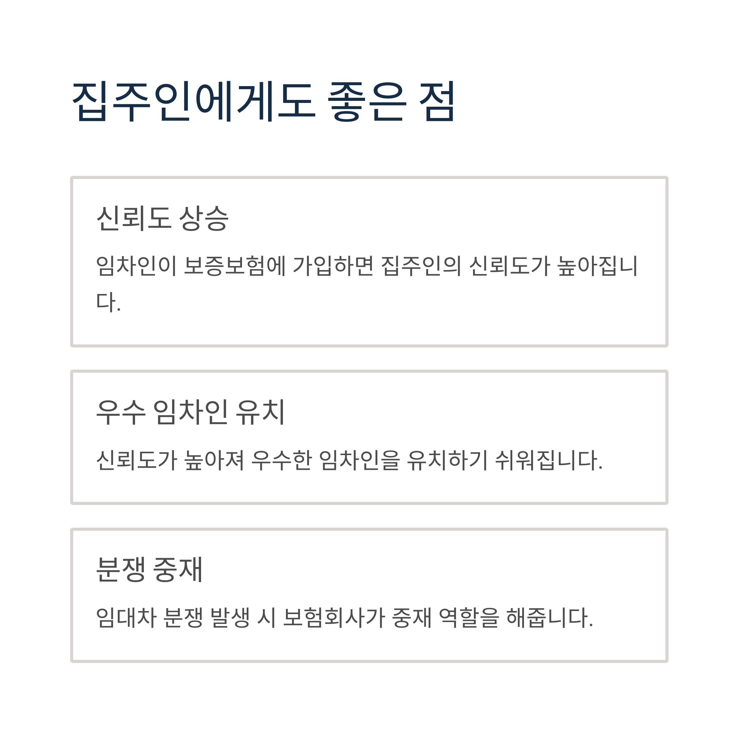 집주인 입장에서도 전세보증보험은 장점이 있습니다. 임차인이 보증보험에 가입하면 신뢰도가 높아져 우수한 임차인을 유치하기 쉬워집니다. 또한 임대차 분쟁 발생 시 보험회사가 중재 역할을 해주므로 집주인도 안심할 수 있습니다.