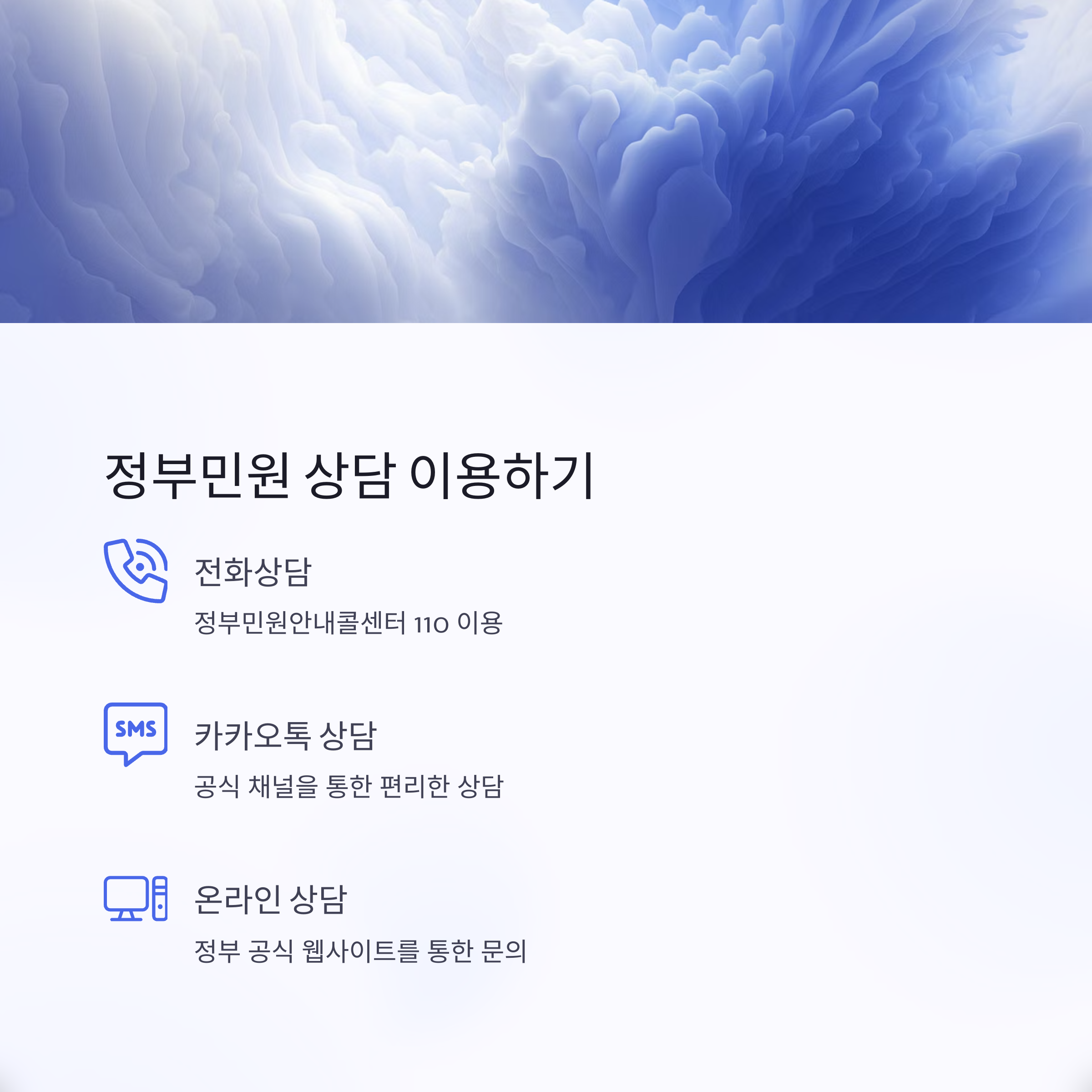 정부민원안내콜센터(110)를 통해 전화상담, 카카오톡 상담, 온라인 상담을 받을 수 있습니다.