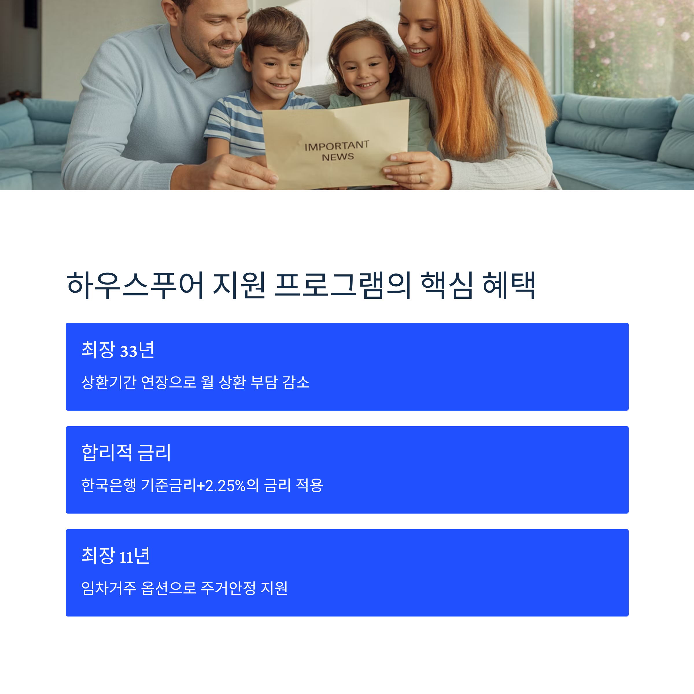 - 임차거주: 주변 월세 수준으로 최장 11년간 거주가 보장되어 주거안정을 지원받을 수 있습니다.