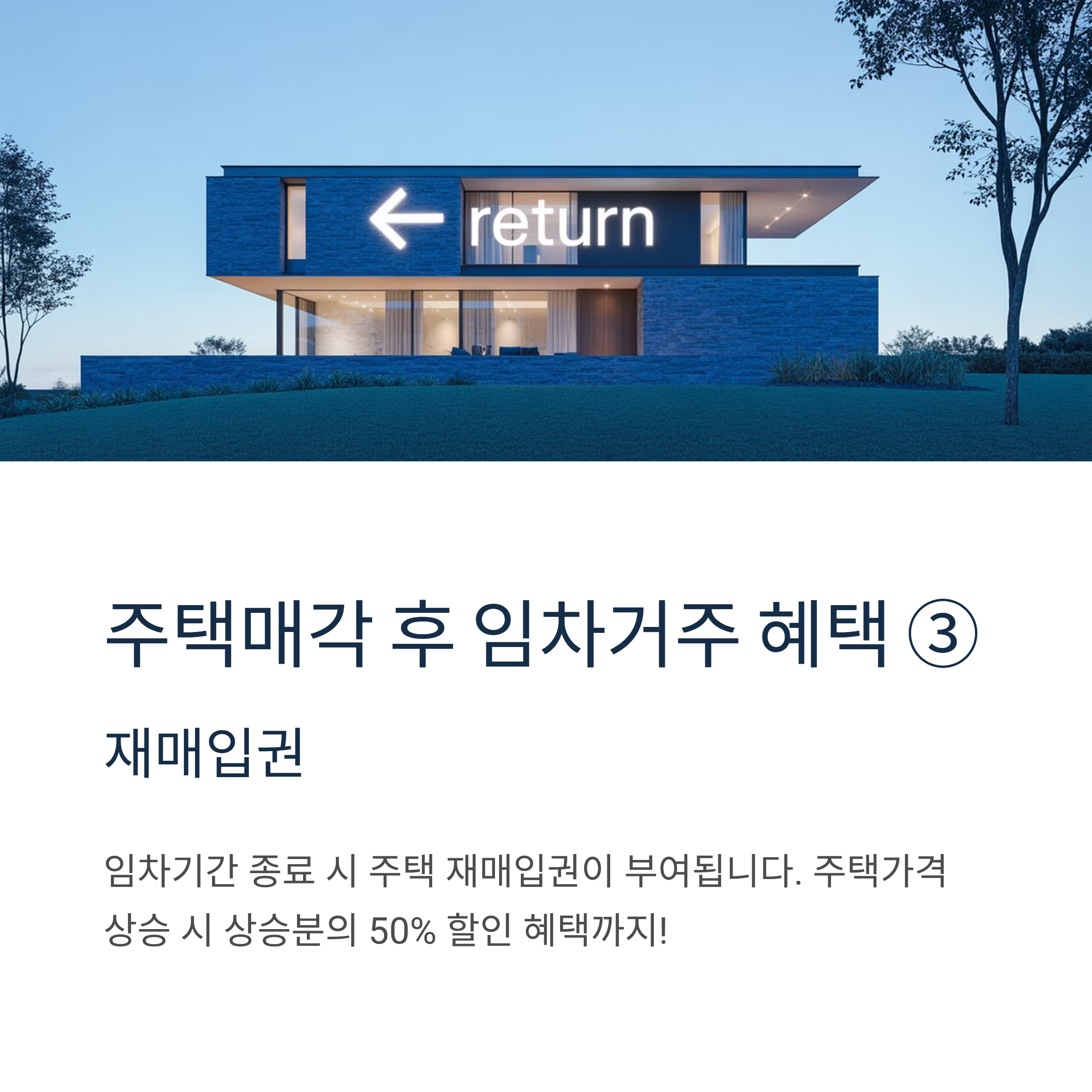 - 재매입권: 임차기간 종료 시 주택 재매입권이 부여되어 경제적 재기 후 내 집 마련의 기회를 다시 얻을 수 있습니다.