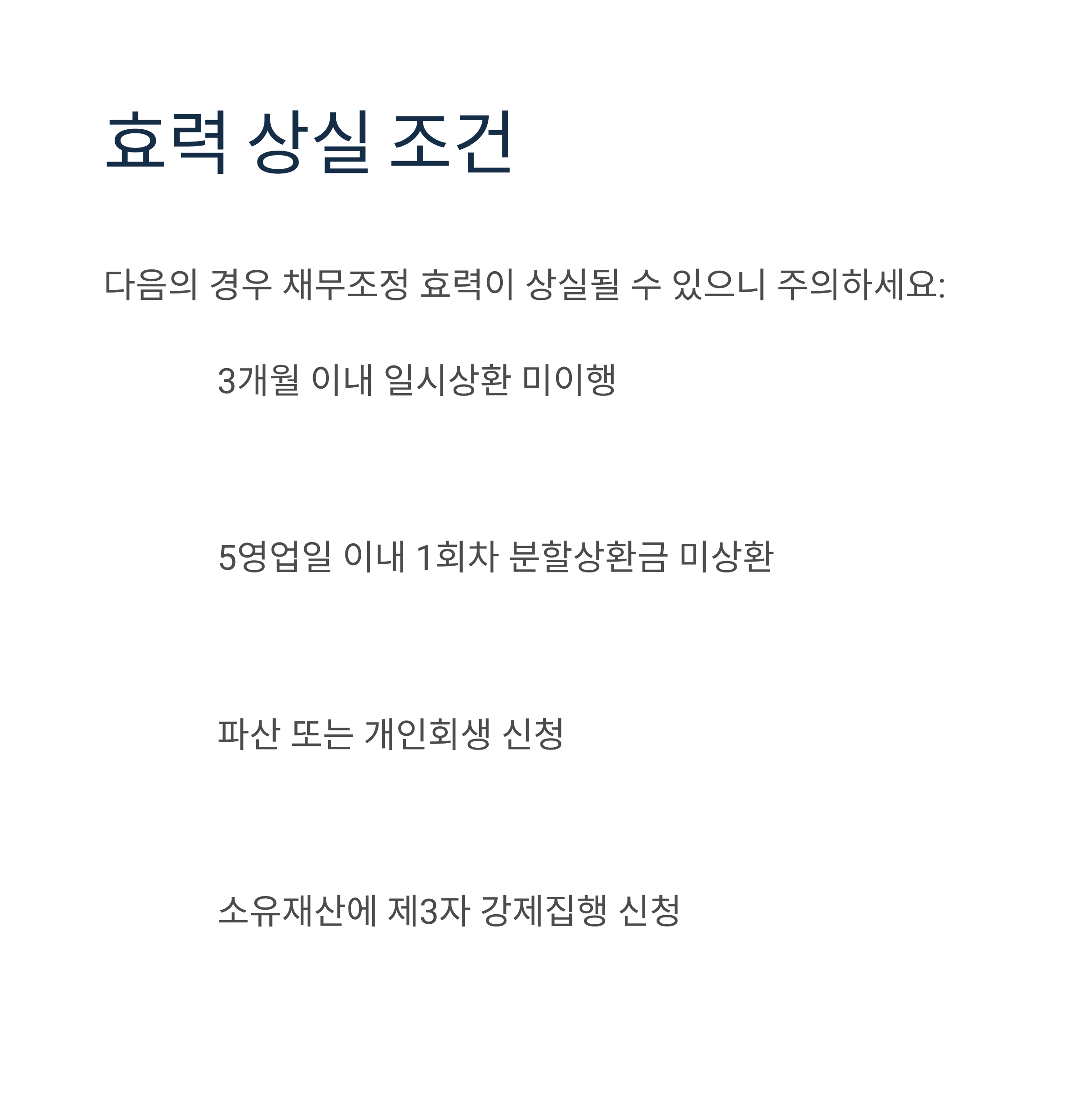 다음의 경우 채무조정 효력이 상실될 수 있으므로 주의해야 합니다: