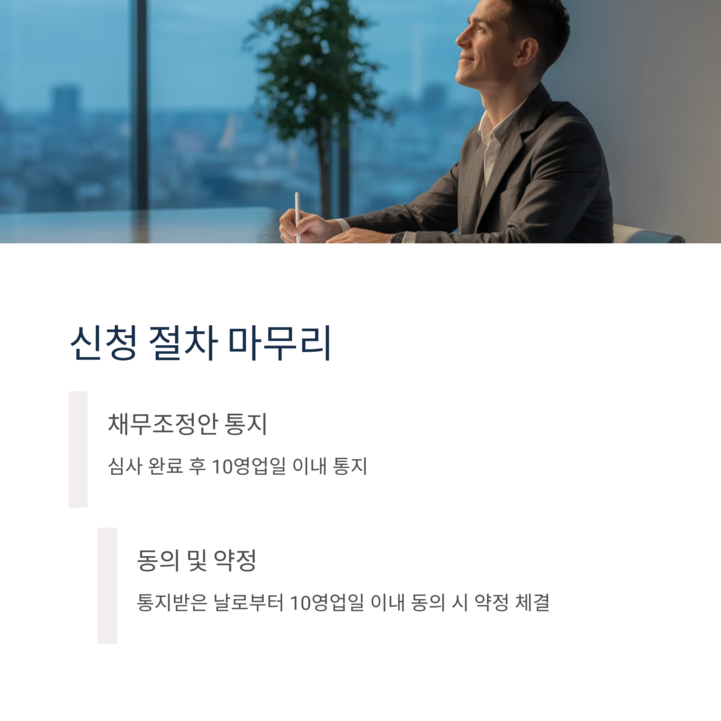 - 동의 및 약정: 통지받은 날로부터 10영업일 이내에 채무조정안에 동의하면 약정이 체결됩니다.