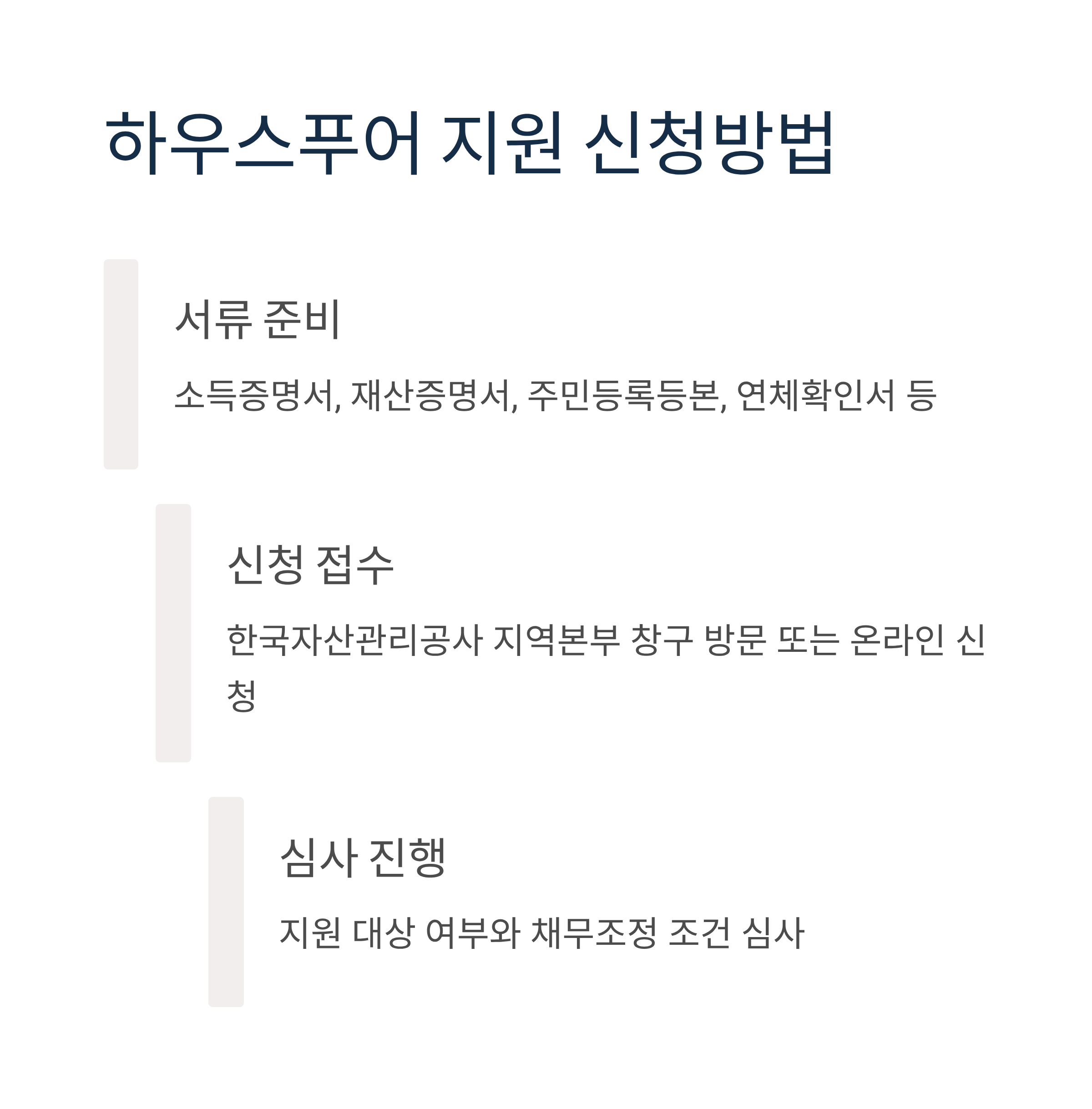 - 서류 준비: 소득증명서, 재산증명서, 주민등록등본, 연체확인서 등 필요 서류를 준비합니다.