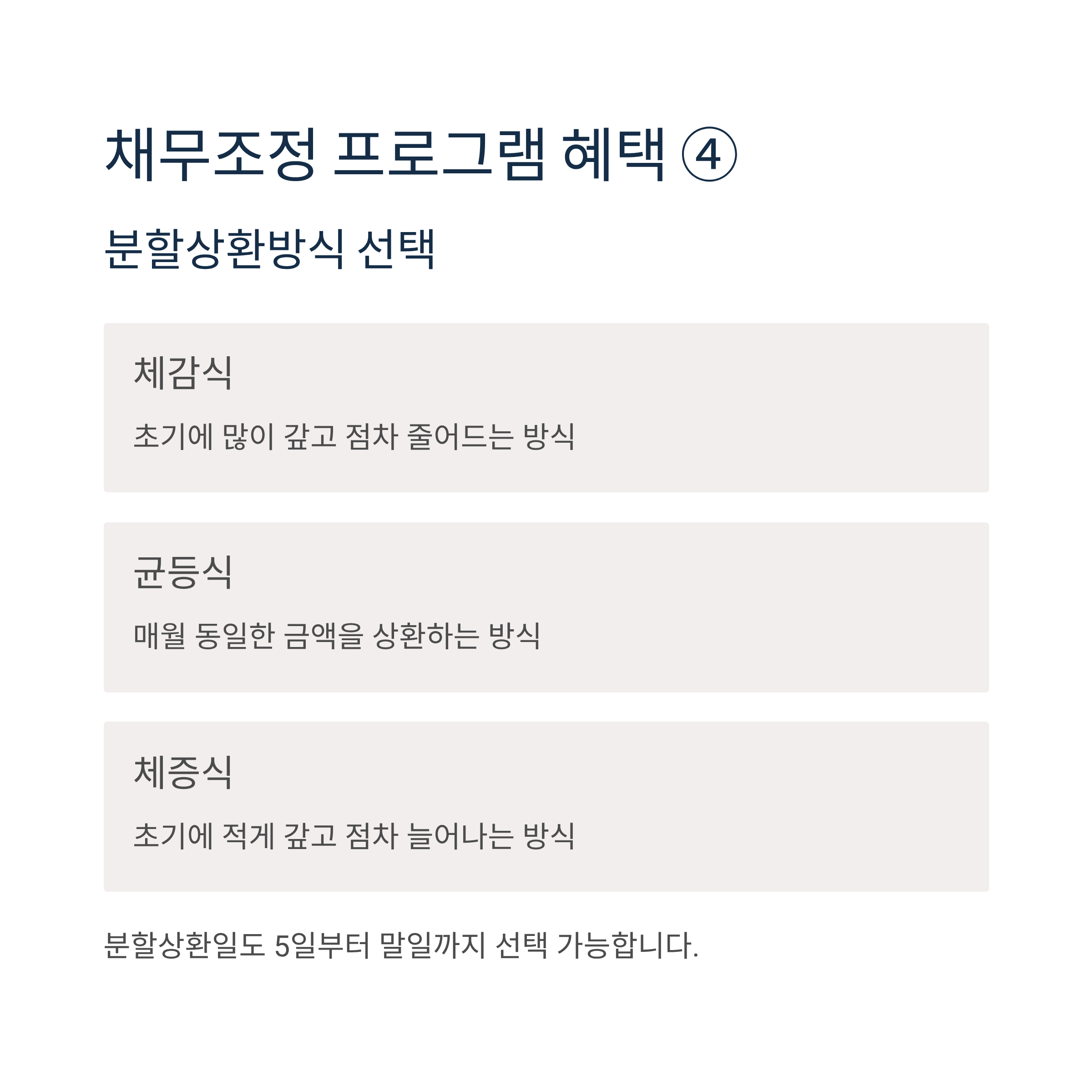 분할상환방식 선택: 체감식, 균등식, 체증식 중 개인 상황에 맞는 상환방식을 선택할 수 있으며, 분할상환일도 5일부터 말일까지 특정하여 선택 가능합니다.