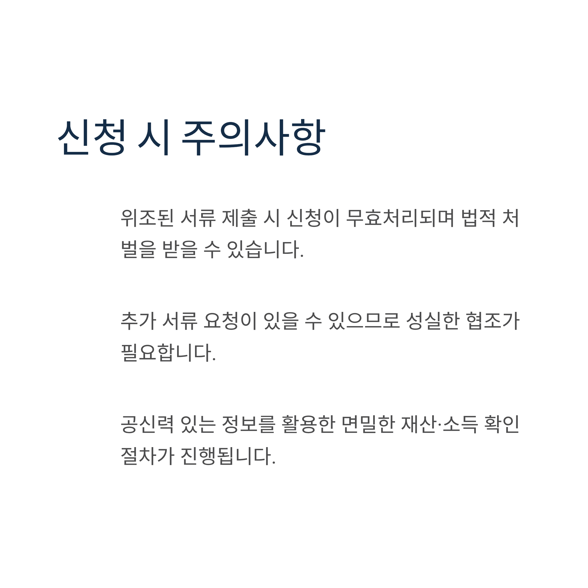 - 공신력 있는 정보를 활용한 면밀한 재산·소득 확인 절차가 진행됩니다.