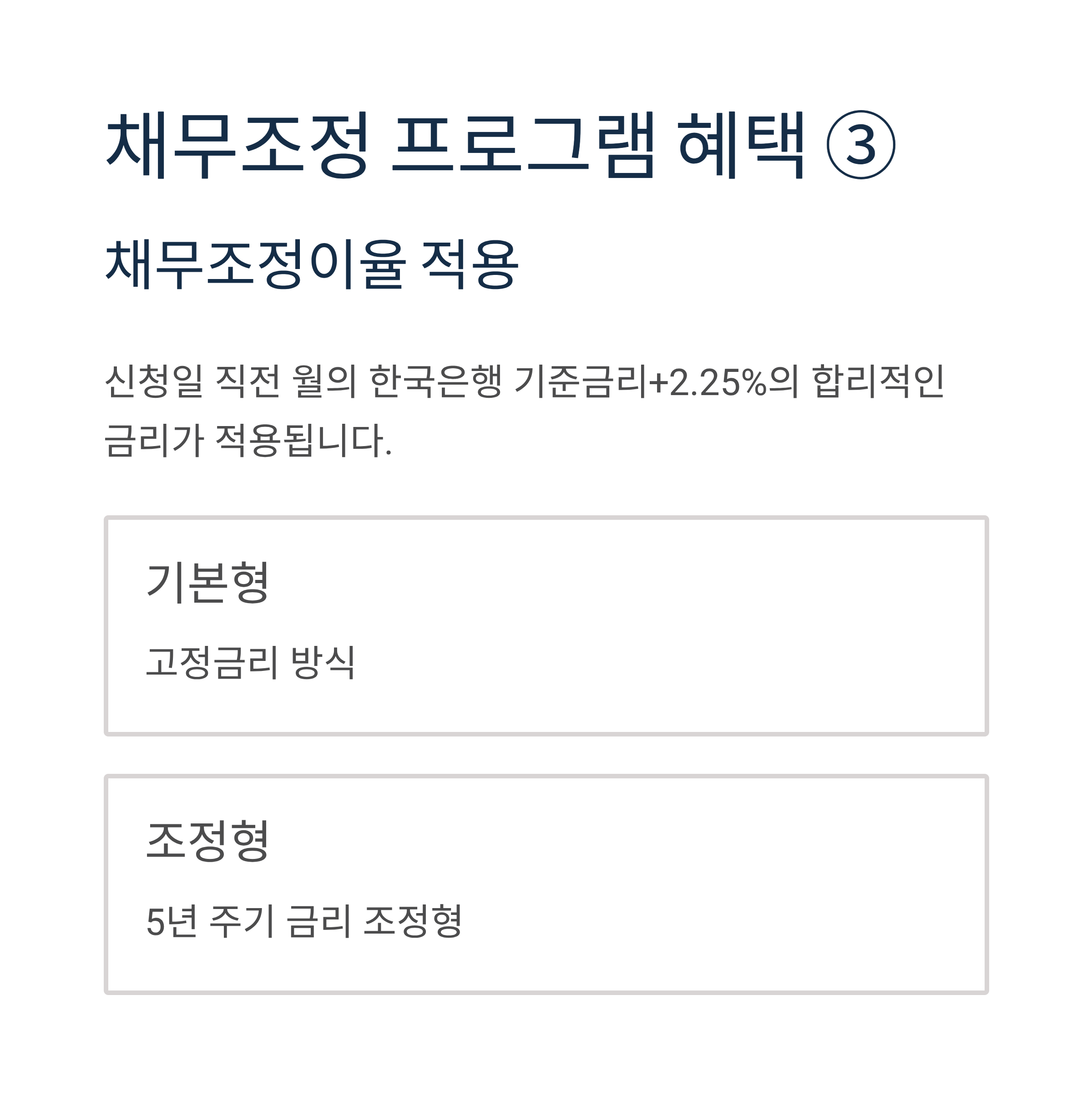 채무조정이율 적용: 신청일 직전 월의 한국은행 기준금리+2.25%라는 합리적인 금리가 적용됩니다. 기본형(고정금리)과 5년 주기 금리 조정형 중 선택할 수 있습니다.