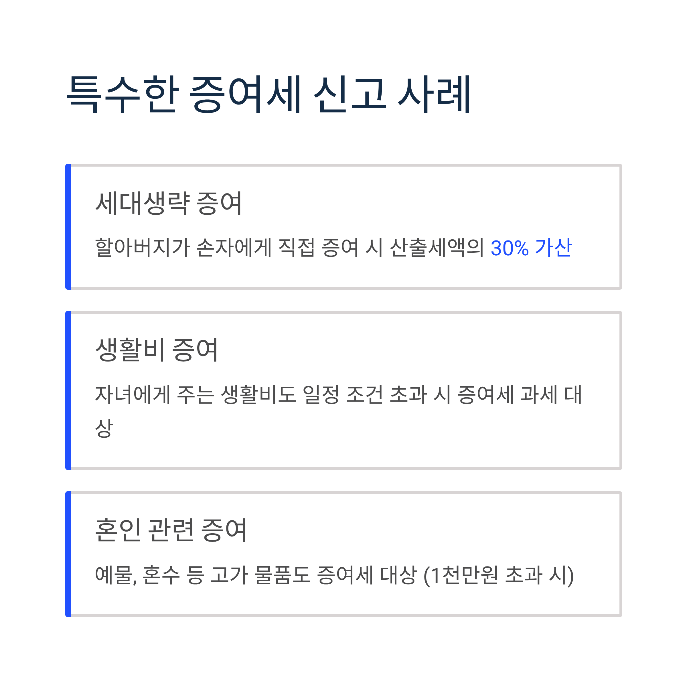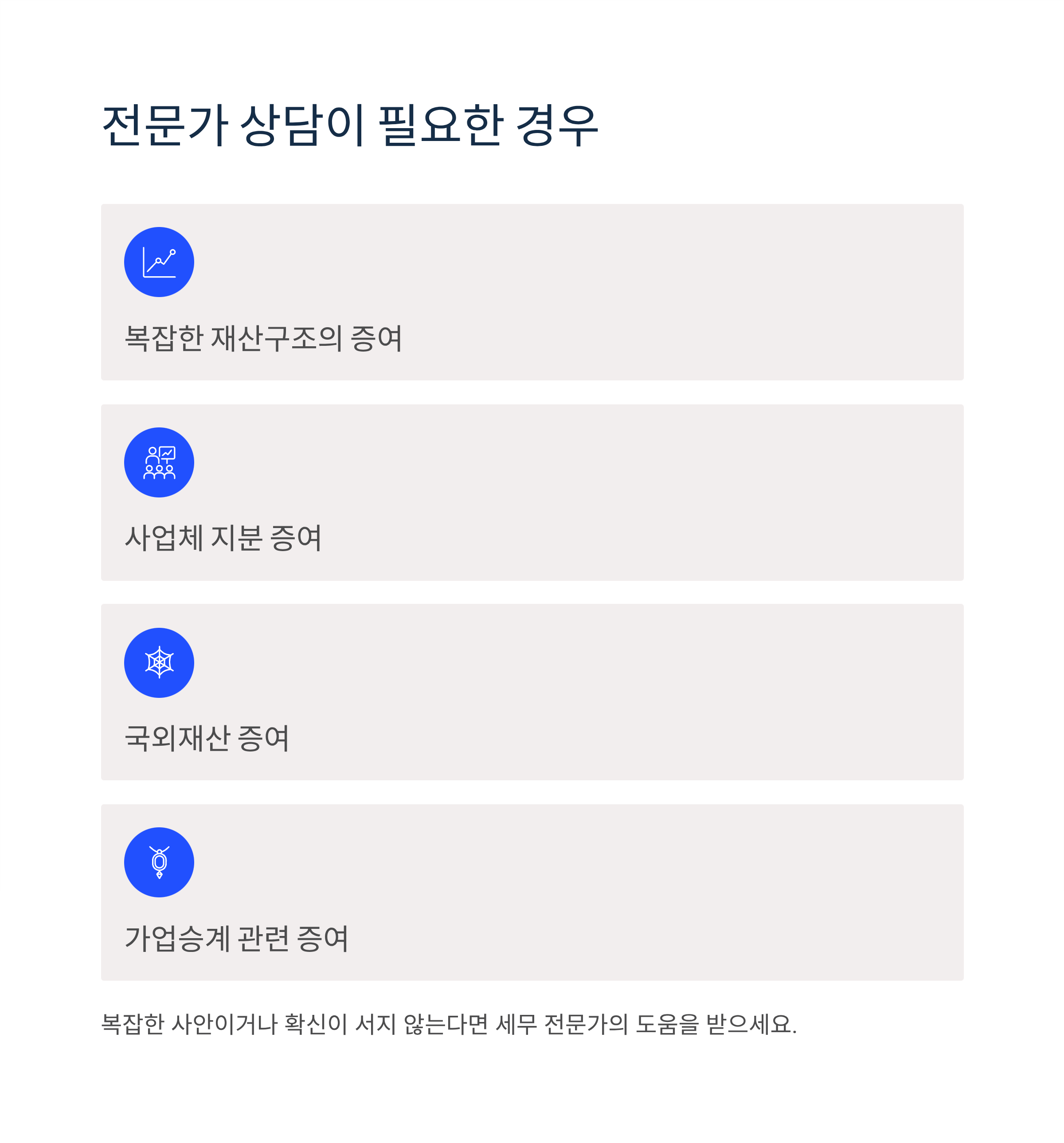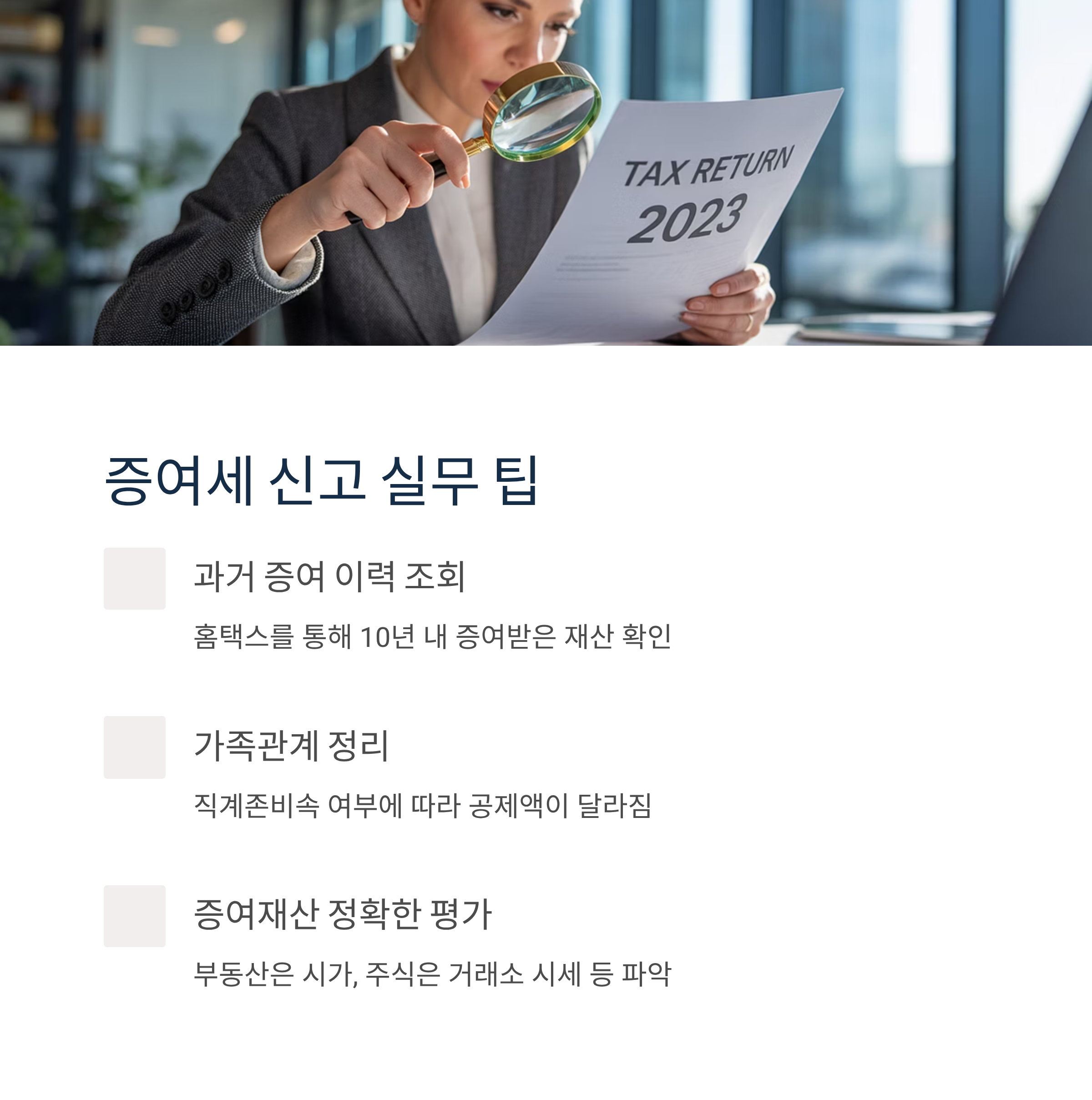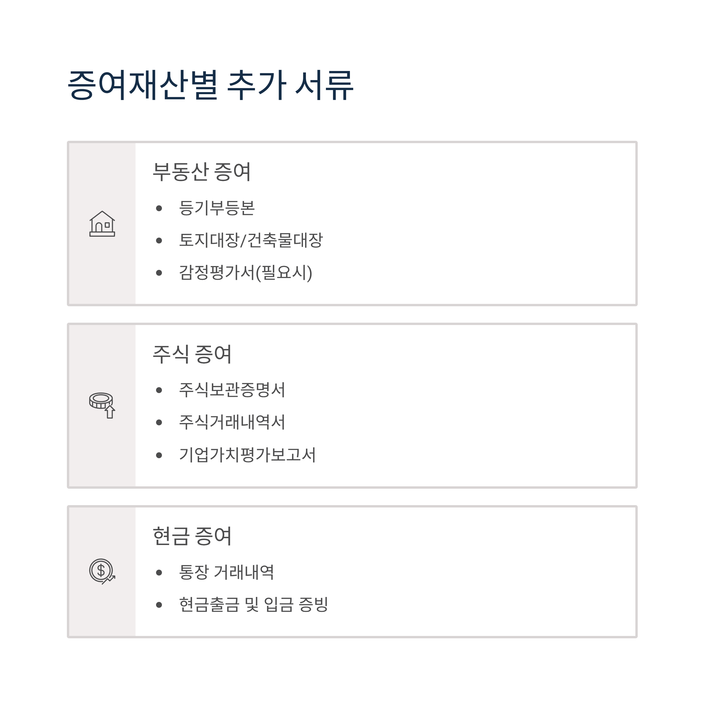 - 증여재산 평가: 부동산은 시가, 주식은 거래소 시세 등을 정확히 파악해야 합니다.