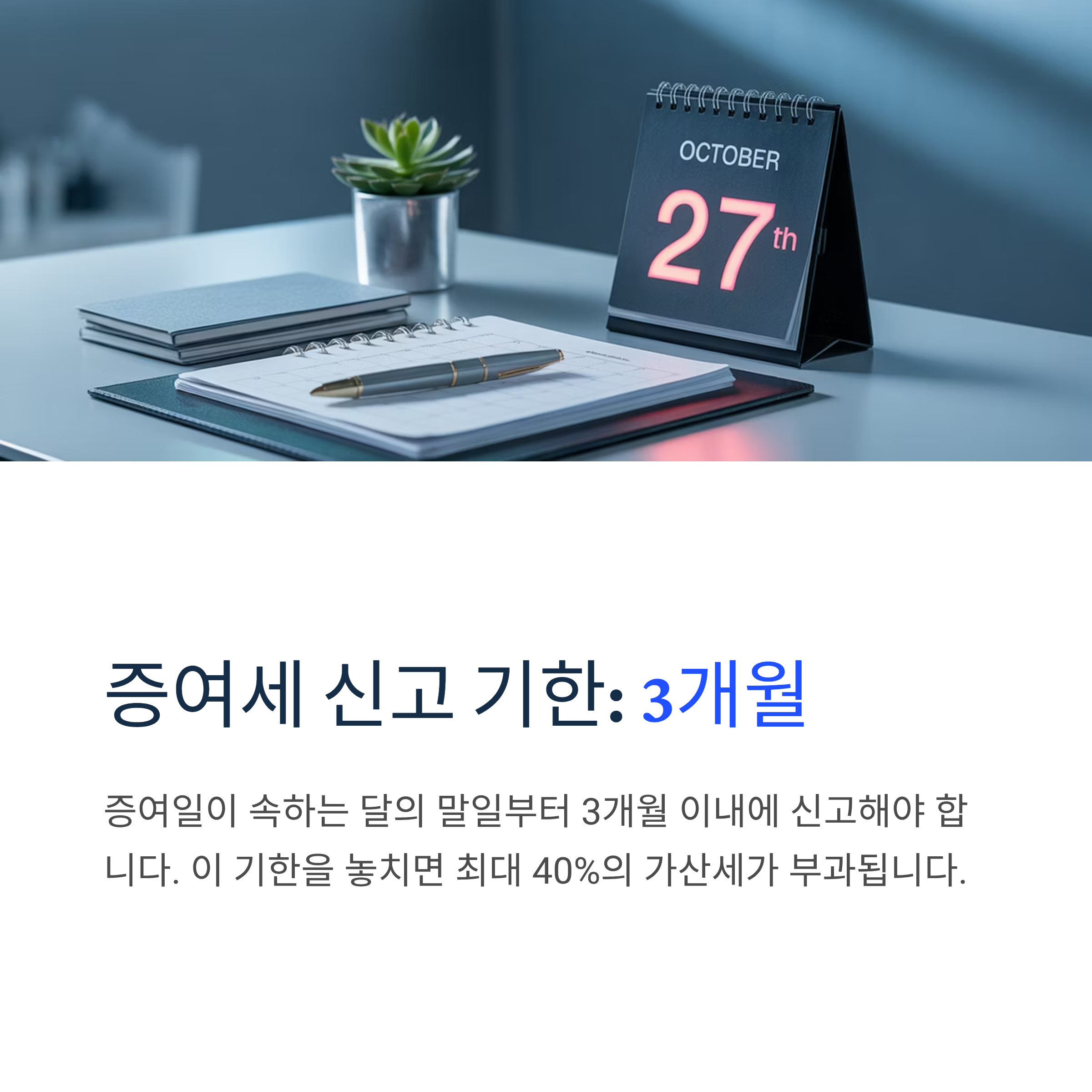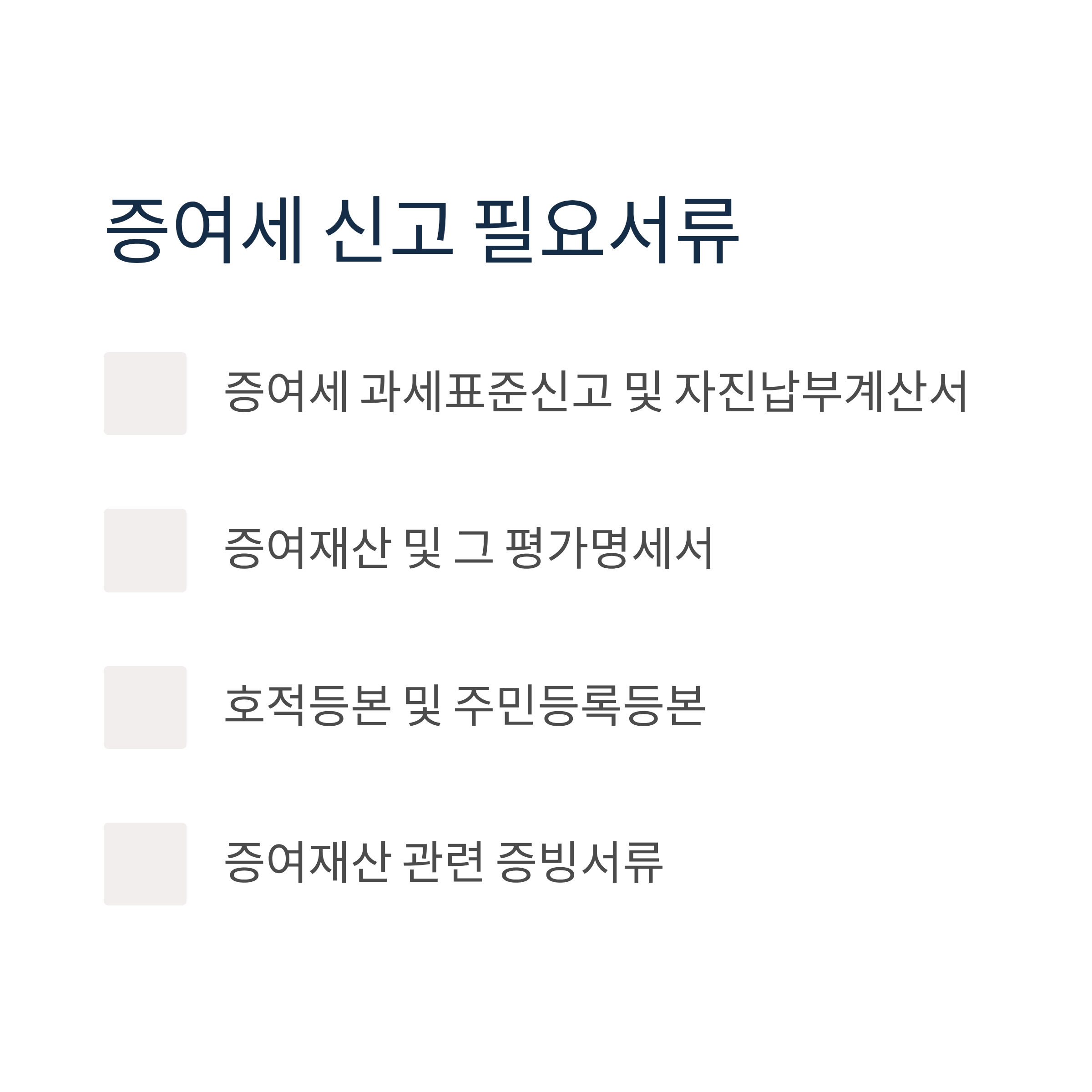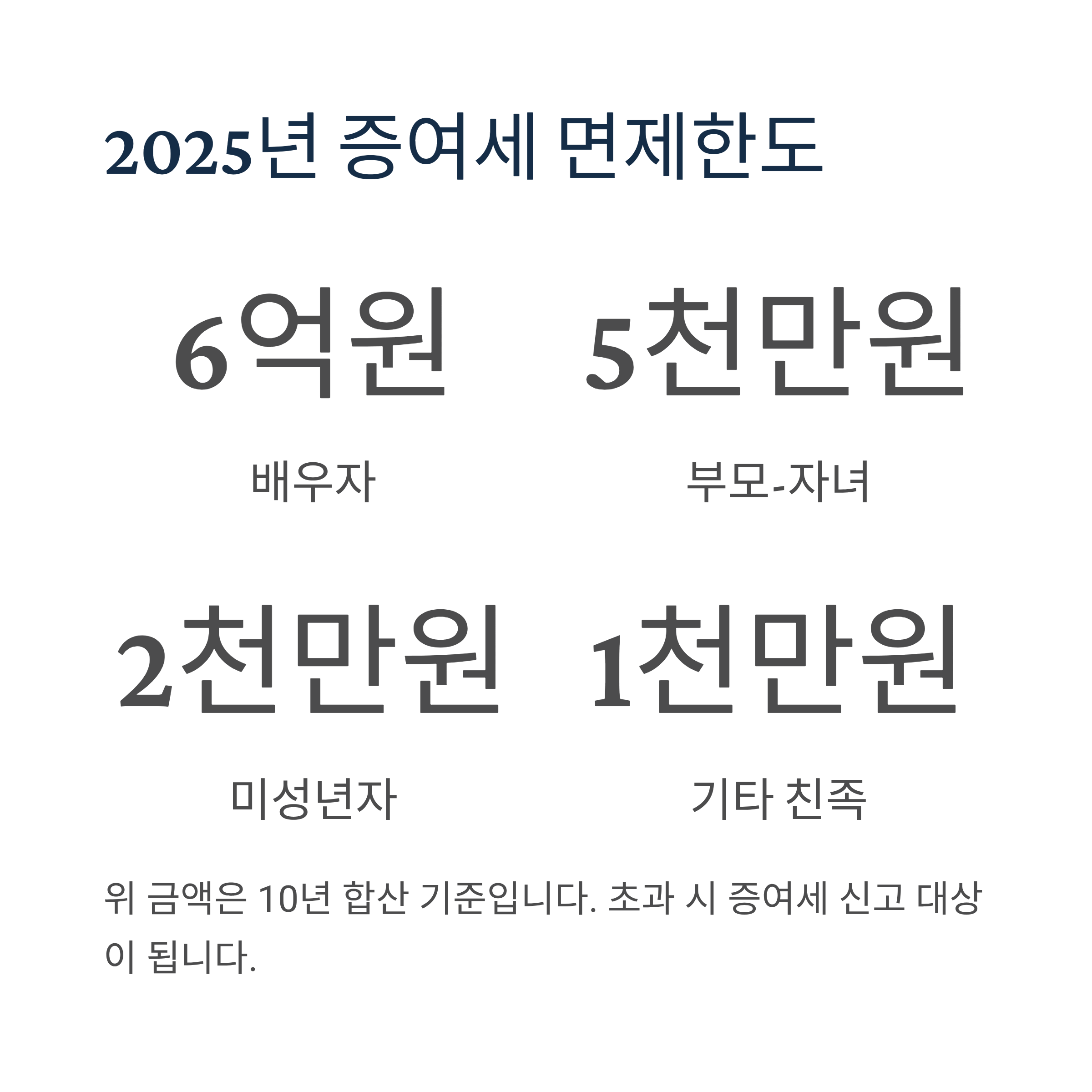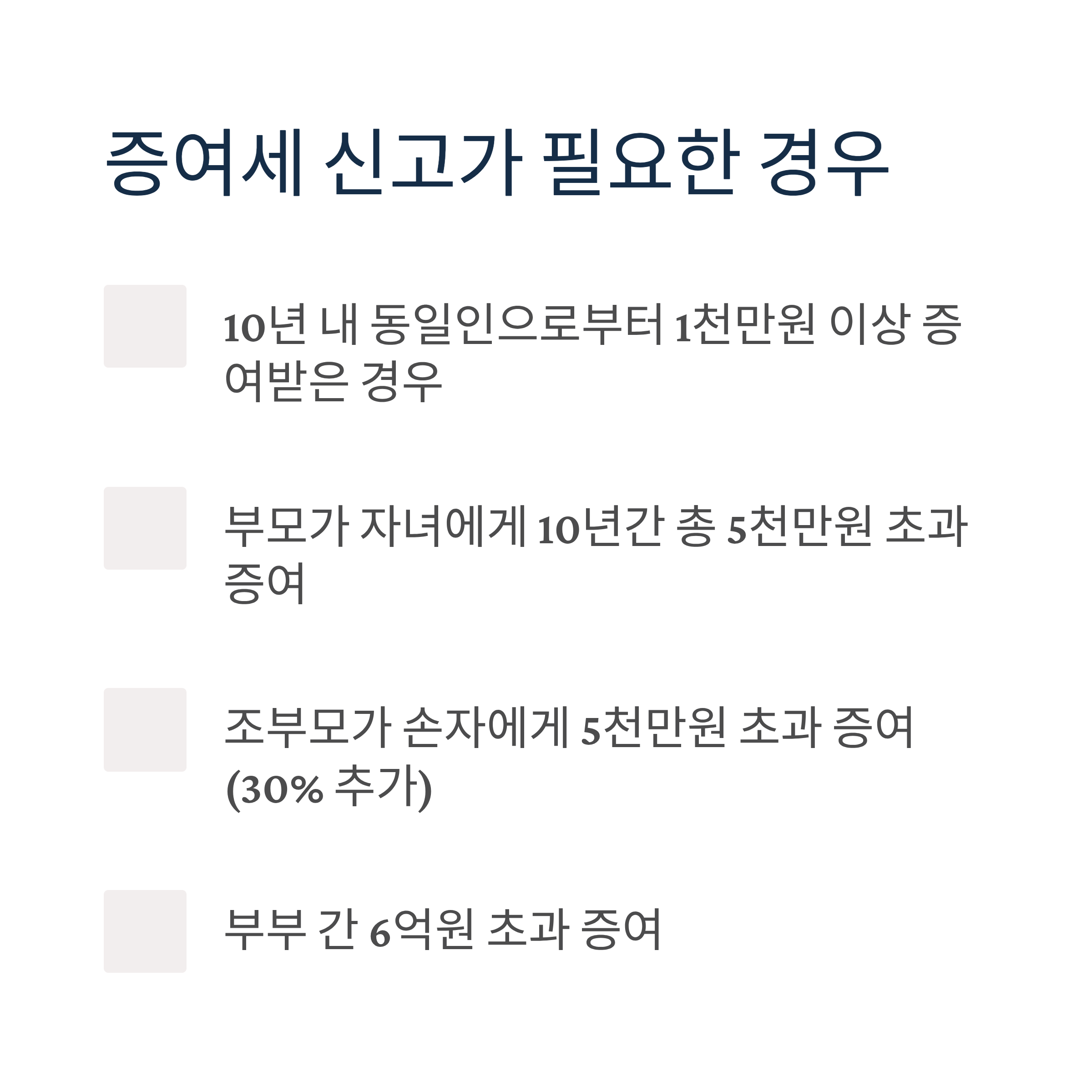 - 증여재산 평가: 부동산은 시가, 주식은 거래소 시세 등을 정확히 파악해야 합니다.