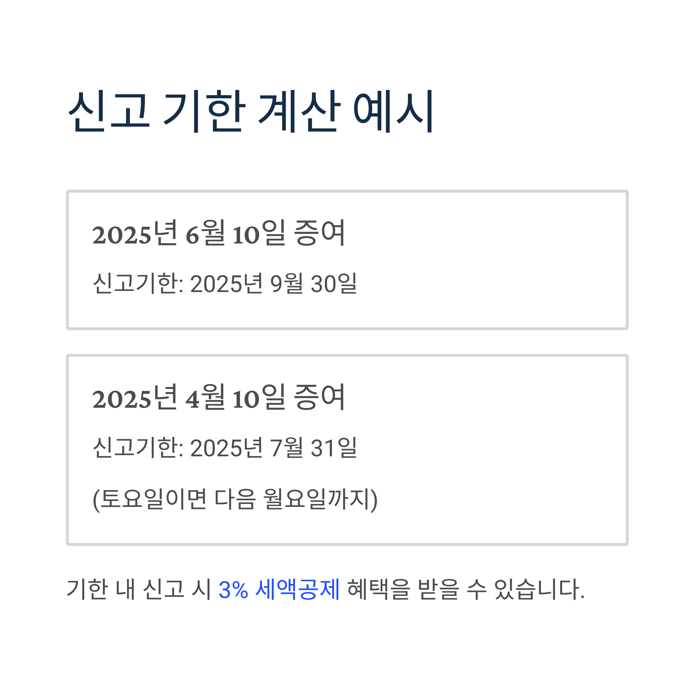 - 증여일이 2025년 4월 10일인 경우 → 신고기한: 2025년 7월 31일 (토요일이면 다음 월요일까지)