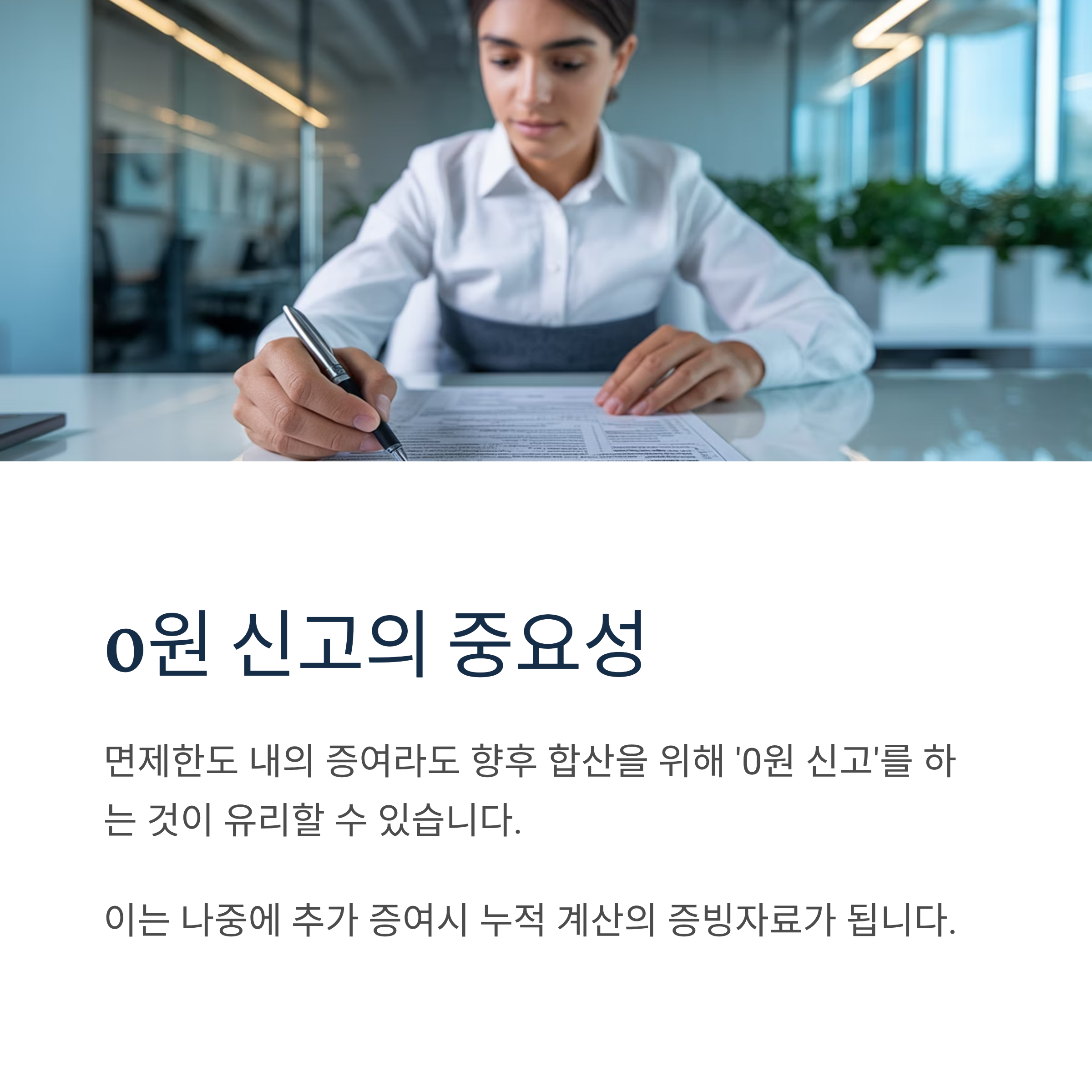 면제한도 내의 증여라도 향후 합산을 위해 '0원 신고'를 하는 것이 유리할 수 있습니다. 이는 나중에 추가 증여시 누적 계산의 증빙자료가 됩니다.