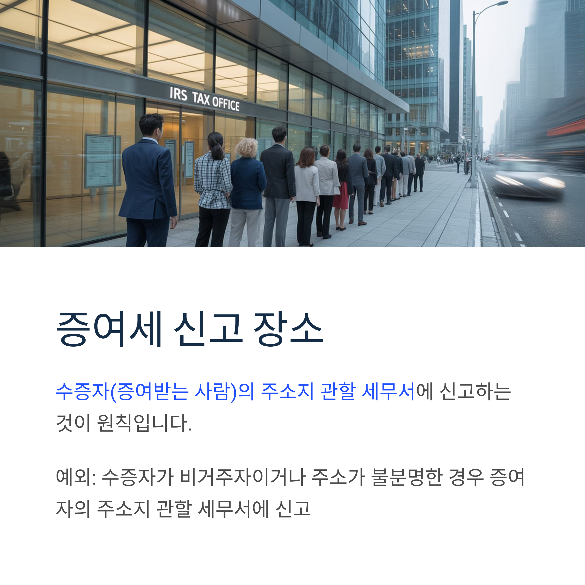 - 수증자가 비거주자이거나 주소가 불분명한 경우: 증여자의 주소지 관할 세무서