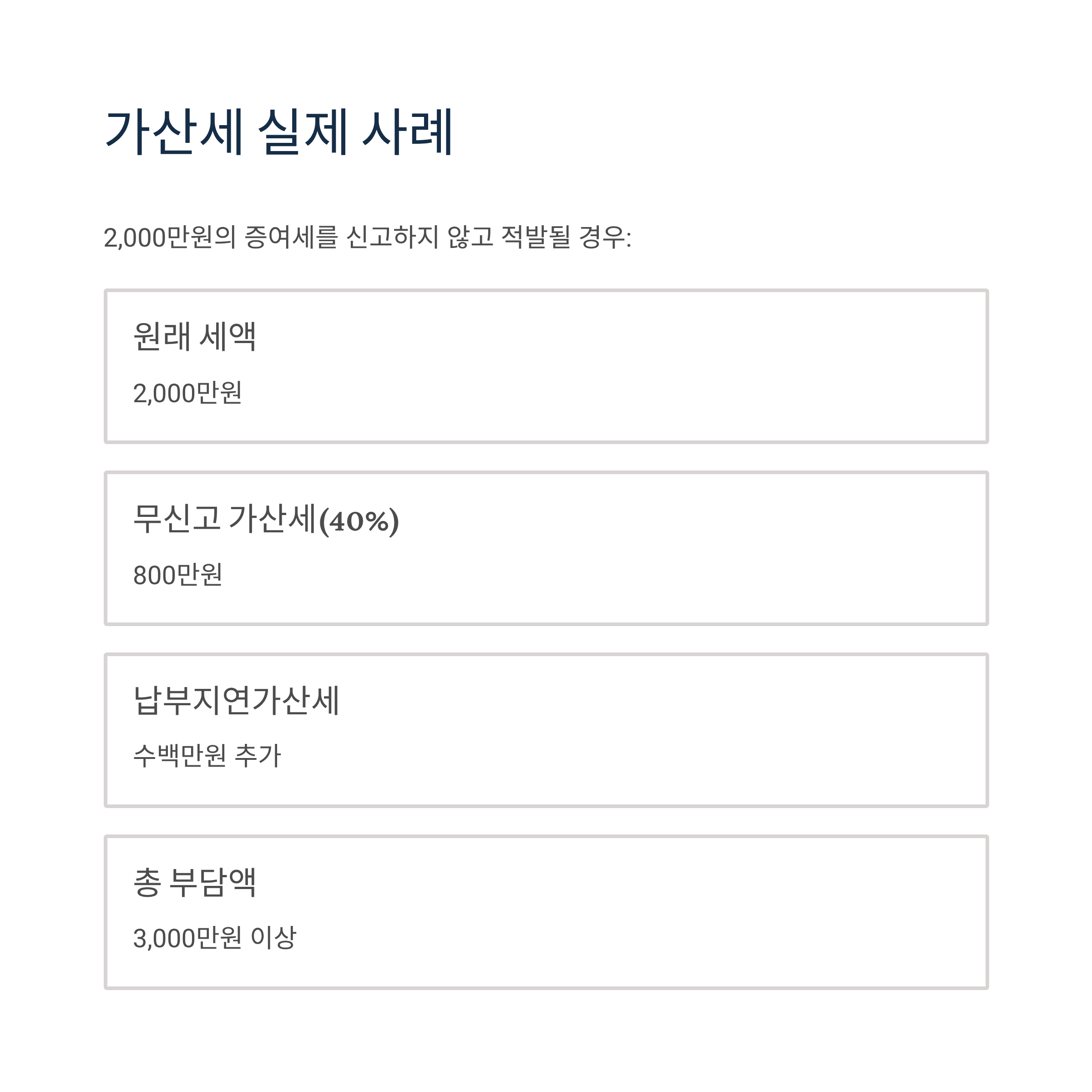 만약 2,000만원의 증여세를 신고하지 않고 적발될 경우: