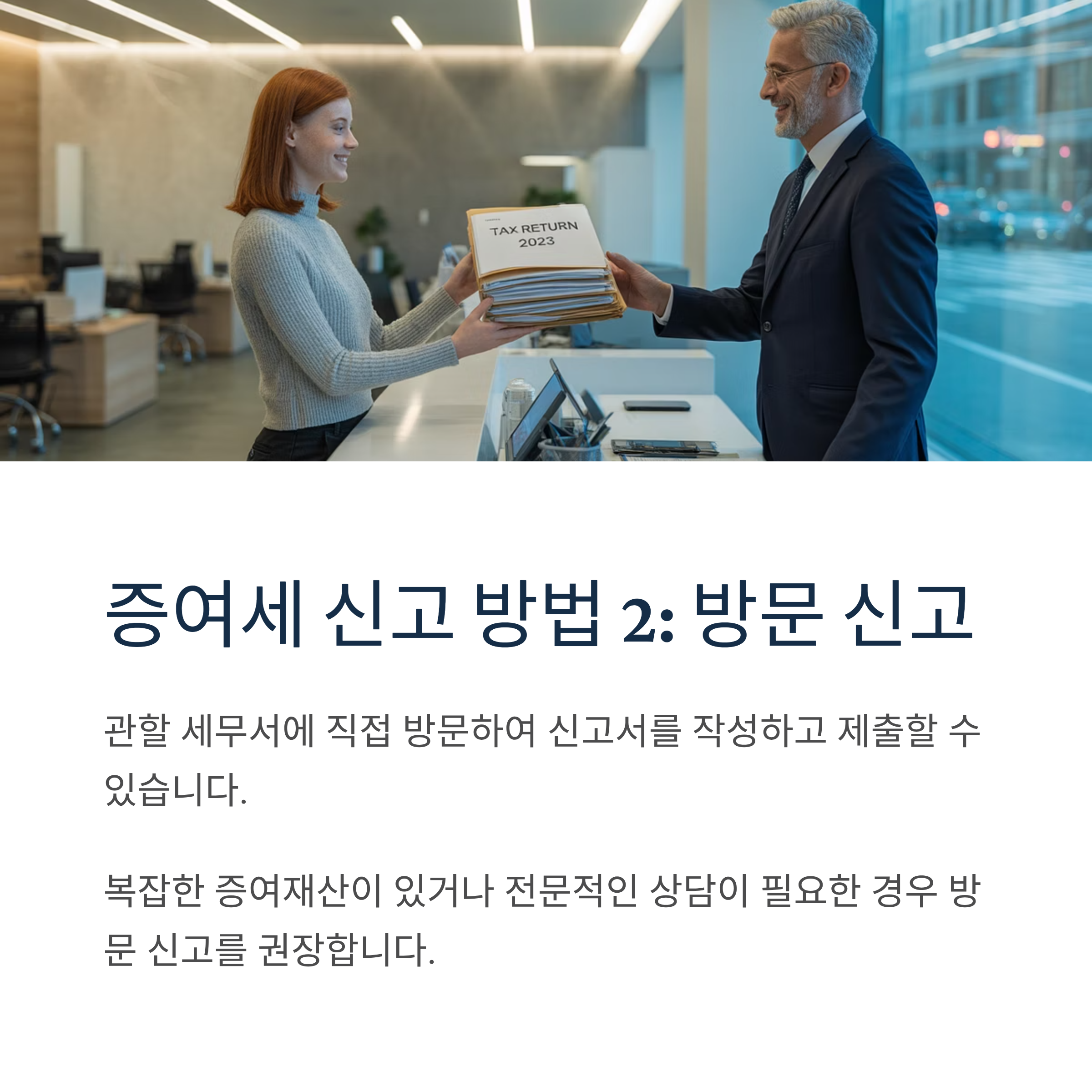 관할 세무서에 직접 방문하여 신고서를 작성하고 제출할 수 있습니다. 복잡한 증여재산이 있거나 전문적인 상담이 필요한 경우 방문 신고를 권장합니다.