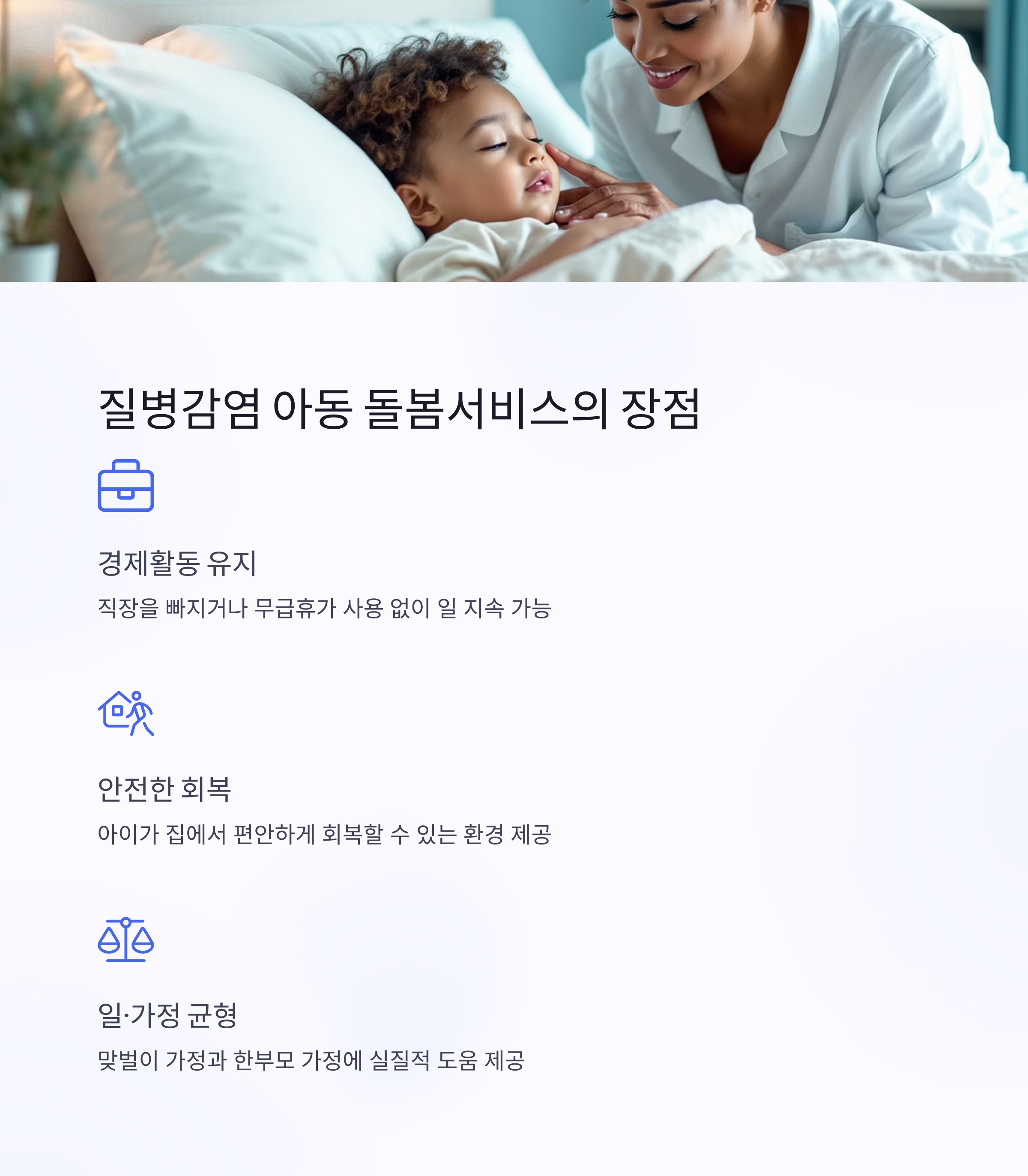특히 수족구병, 감기 등으로 어린이집이나 학교에 갈 수 없는 상황에서 부모의 경제활동 중단 없이 양질의 돌봄을 받을 수 있다는 점이 큰 장점입니다.