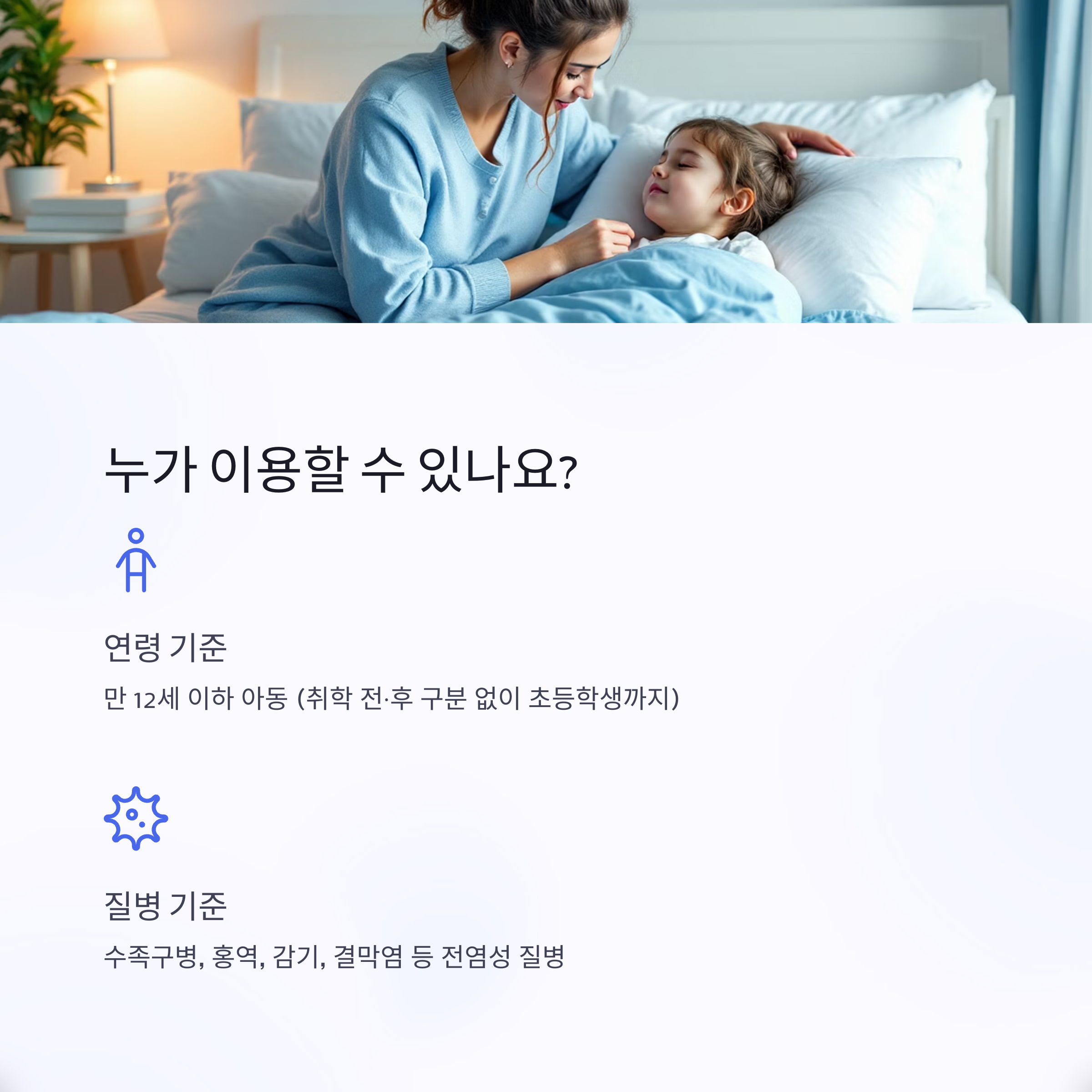 질병감염 아동 돌봄 서비스는 전염성 질병에 감염된 만 12세 이하 아동을 대상으로 전문 아이돌보미가 가정을 방문하여 돌봄을 제공하는 정부 지원 서비스입니다. 아이가 아파서 어린이집이나 학교에 갈 수 없을 때, 부모의 일·가정 양립을 지원하는 핵심적인 육아 지원 정책입니다.