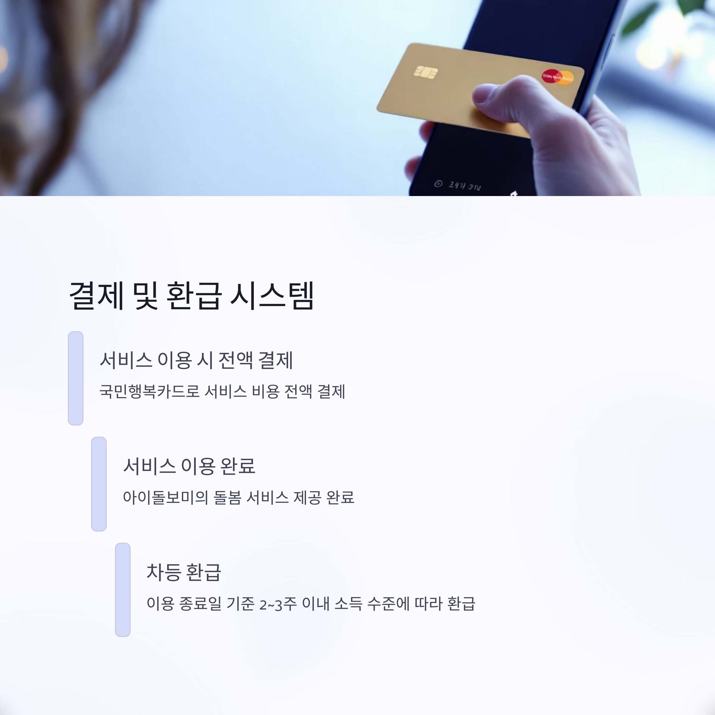 질병감염 아동 돌봄서비스는 선결제 후 환급 방식으로 운영됩니다. 서비스 이용 시 전액을 본인이 부담하여 결제한 후, 이용 종료일 기준 2~3주 이내에 가구 소득 수준에 따라 차등 환급받을 수 있습니다.